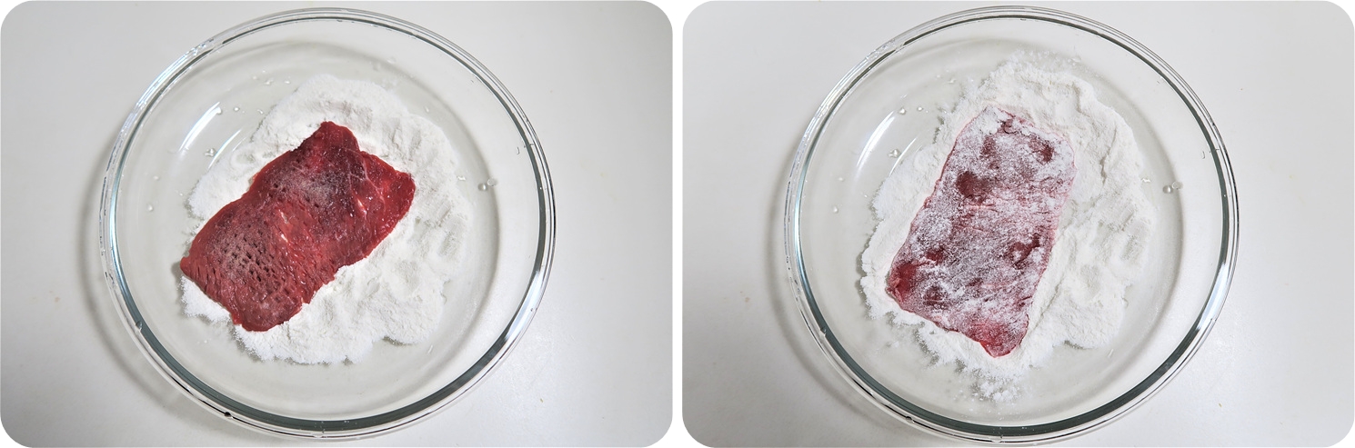 밑간을 한 후 찹쌀가루를 고기 앞뒤로 고루 묻혀줍니다.