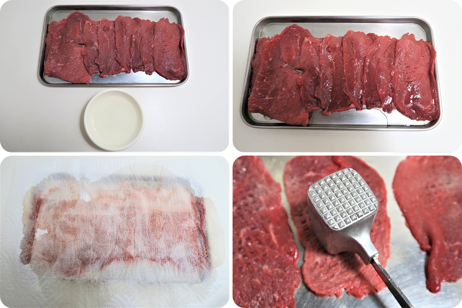 그리고 나서 고기망치로 두드려서 고기를 연하게 해요. 고기 망치가 없는 분들은 칼끝으로 톡톡 두드려 주셔도 됩니다.