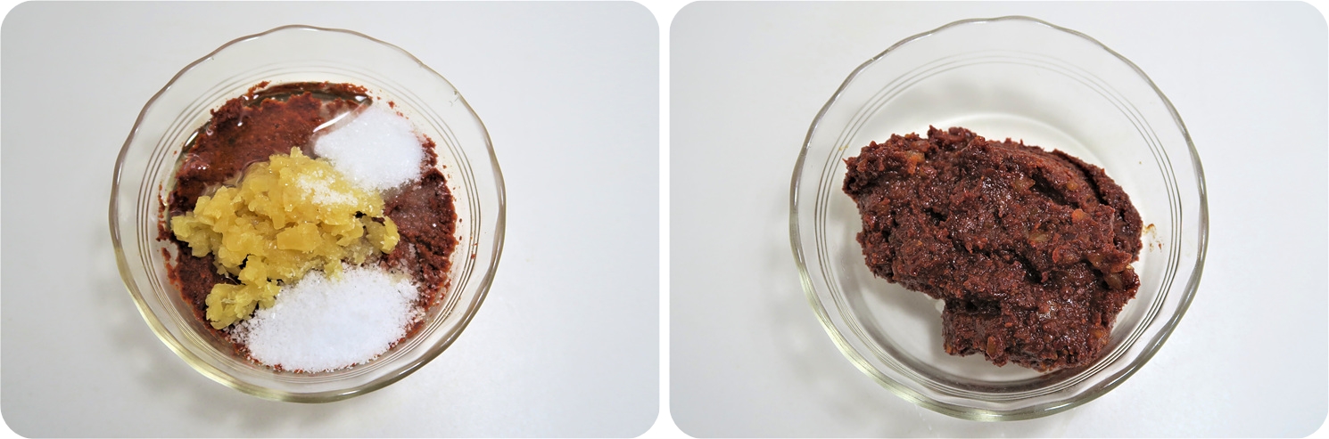 불린 고춧가루 3큰술에 물 1큰술, 다진 마늘 1큰술, 물엿 1큰술, 소금 1큰술, 설탕 1큰술을 넣어 양념을 만들면 됩니다.