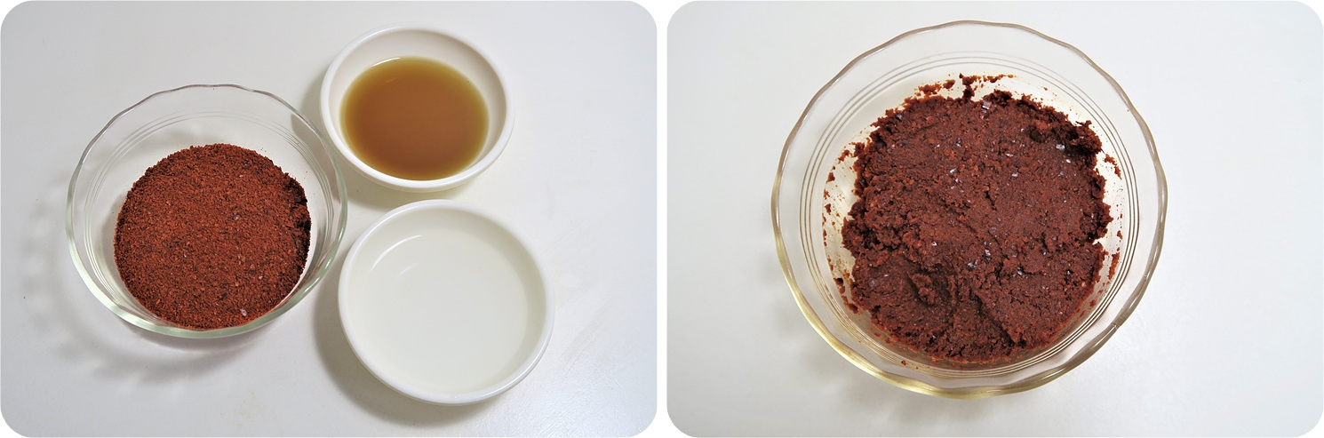 고춧가루 500g에 미지근한 물 3큰술, 멸치액젓 3큰술을 섞어서 30분 정도 불려주세요.