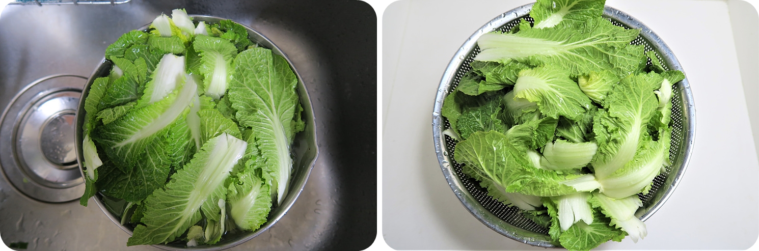 봄동에 흙이 많았는데요. 15분 동안 찬물에 담가 두었다가 서너 번 헹궈서 물기를 제거했어요.