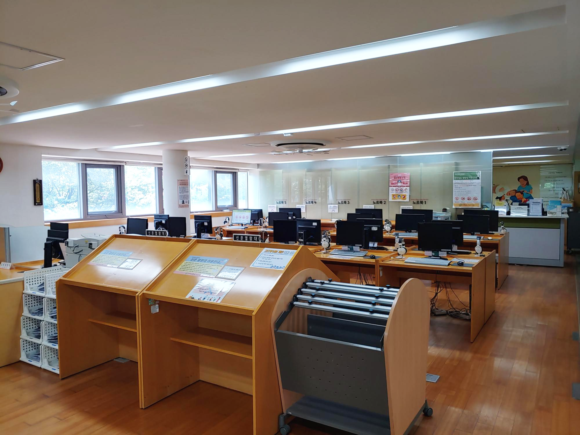 2층에 있는 전자정보열람실은 지금 부분 리모델링 공사를 하고 있습니다. 보다 쾌적하고 이용하기 좋은 공간으로 거듭나고 있음을 확인할 수 있었지요.