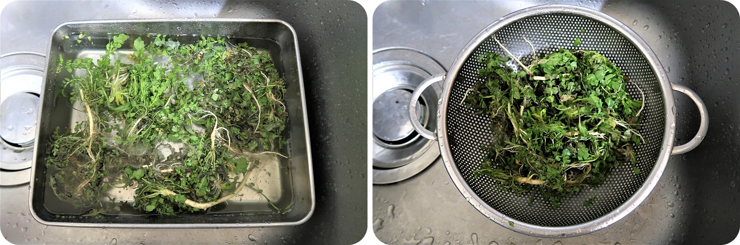 손질한 냉이는 찬물에 식초 2큰술을 넣고 10분간 담궈두었다가 맑은 물에 서너번 헹궈줍니다.