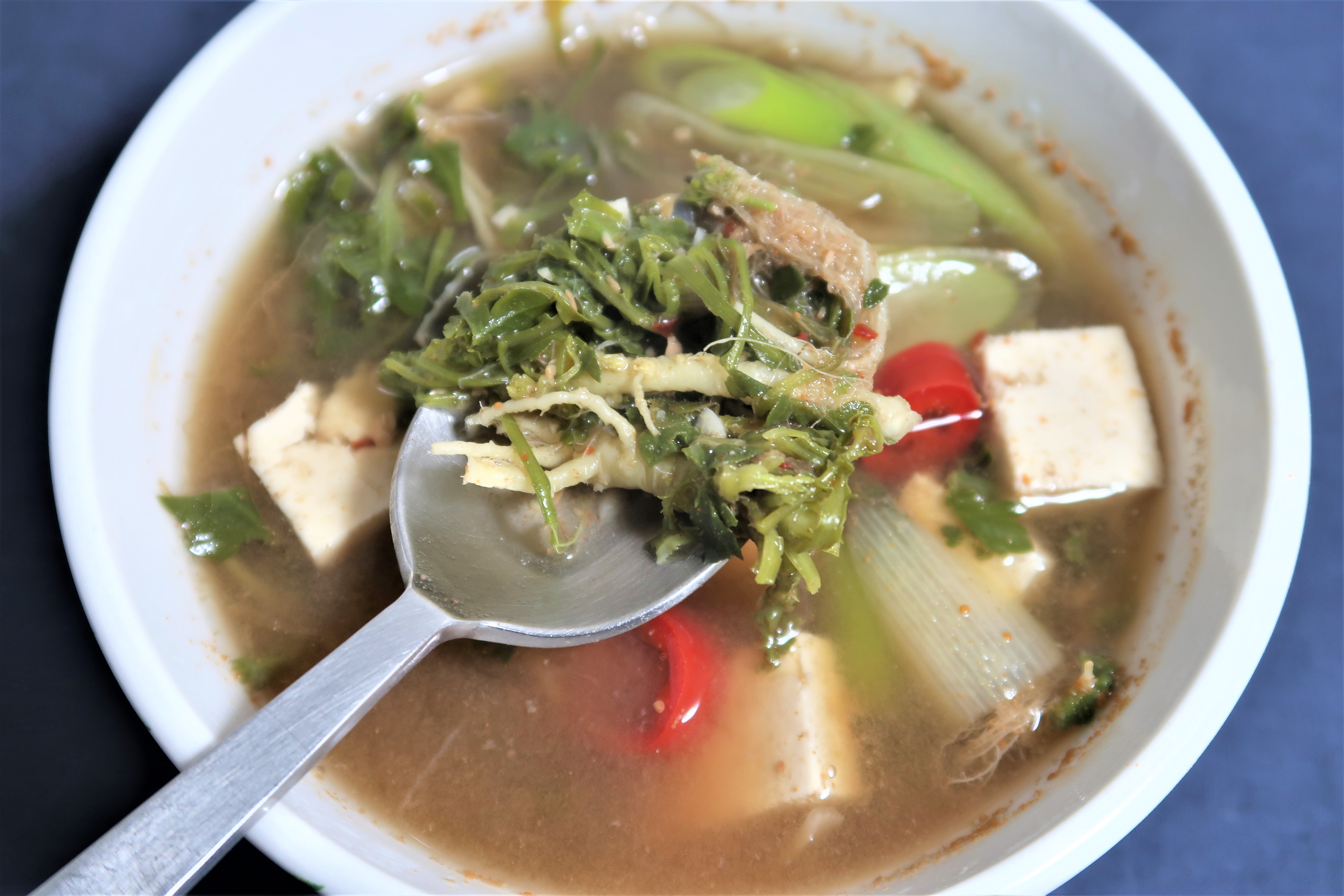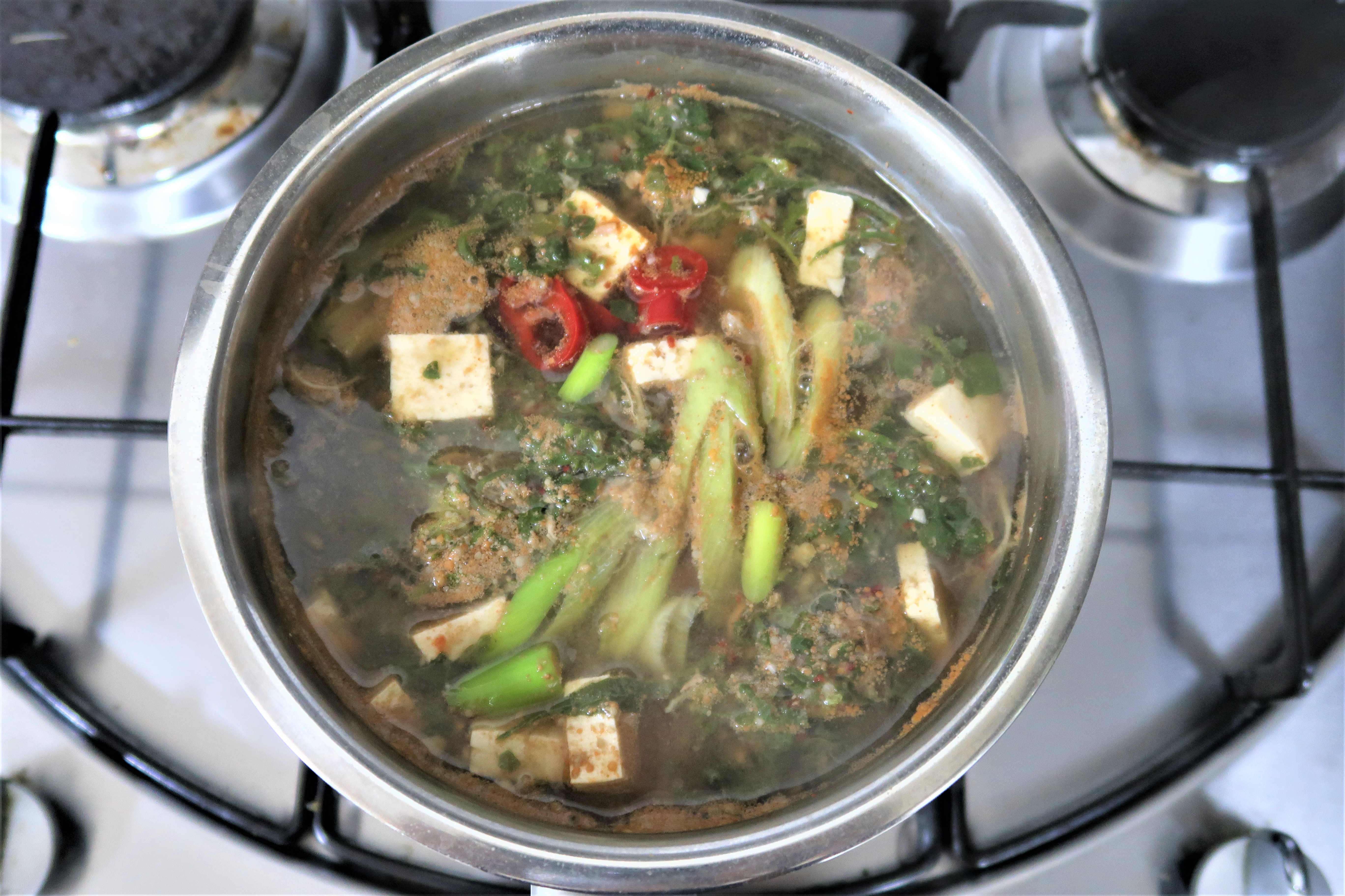 재료 냉이 100g, 물 1리터, 멸치 다시마팩 1개, 두부 1/4모, 홍고추 1개, 대파 1/4대, 된장 2큰술, 국간장 1큰술, 청주 1큰술, 다진마늘 1큰술, 고춧가루 2/3큰술 등