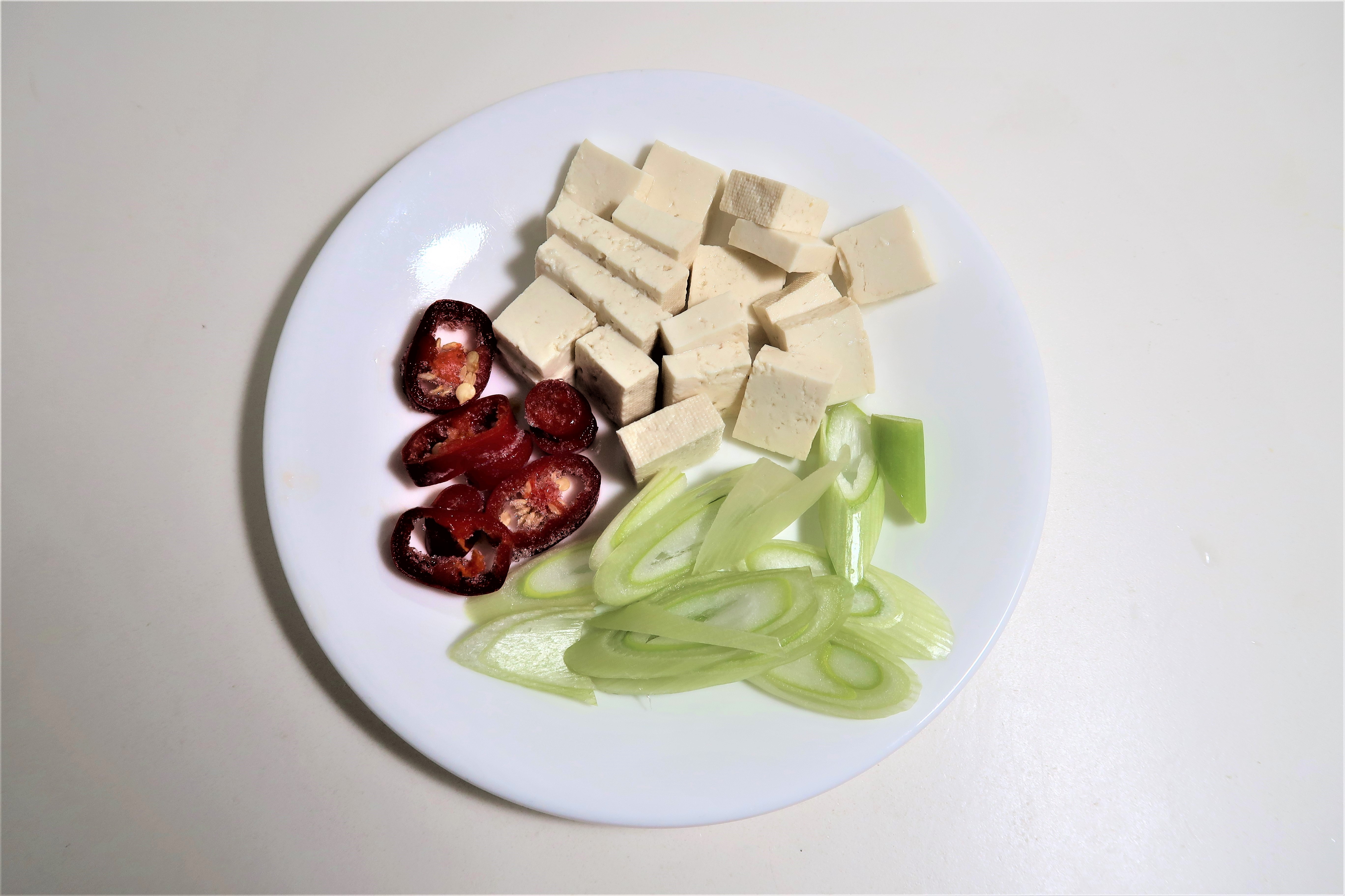 두부는 작게 네모지게 썰고 홍고추와 대파는 어슷썰어줍니다.