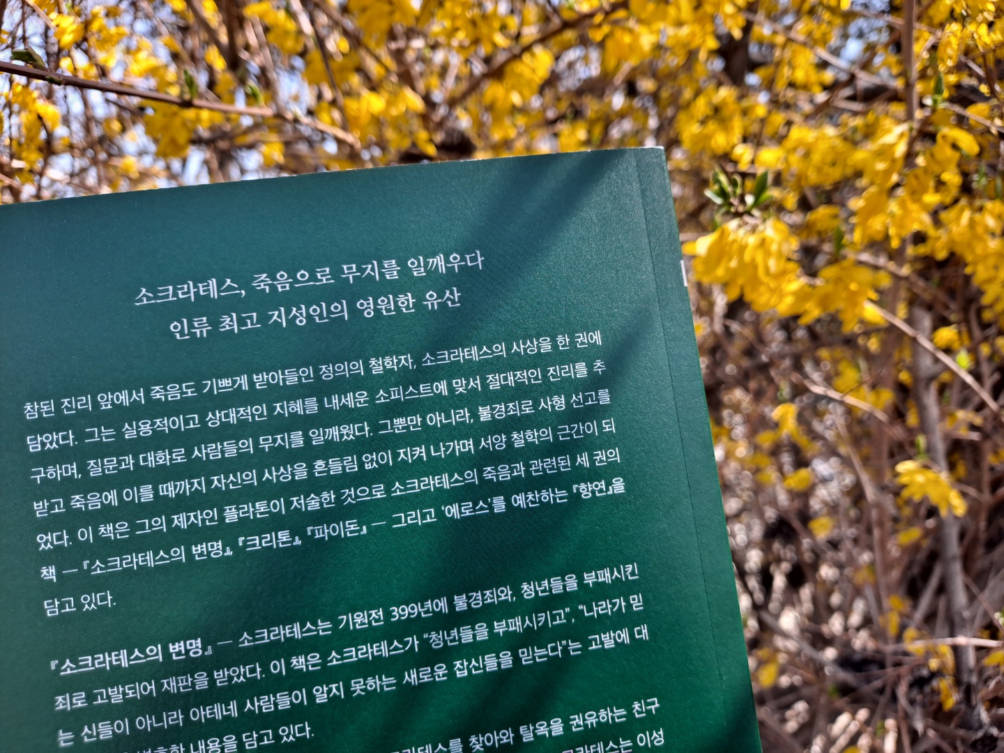 이 책은 소크라테스의 치열하면서도 경건한 철학 정신이 잘 묘사되어 있지요. 막연하게 어렵게만 생각하여 읽지 못하셨다면 이 기회에 한 번 읽어보셨으면 합니다. 객관적인 삶의 태도와 정신의 일치가 더없이 소중하게 느껴지는 책으로 추천합니다.