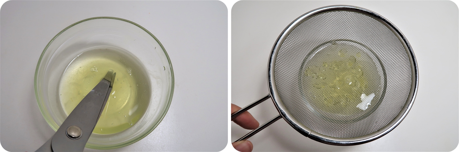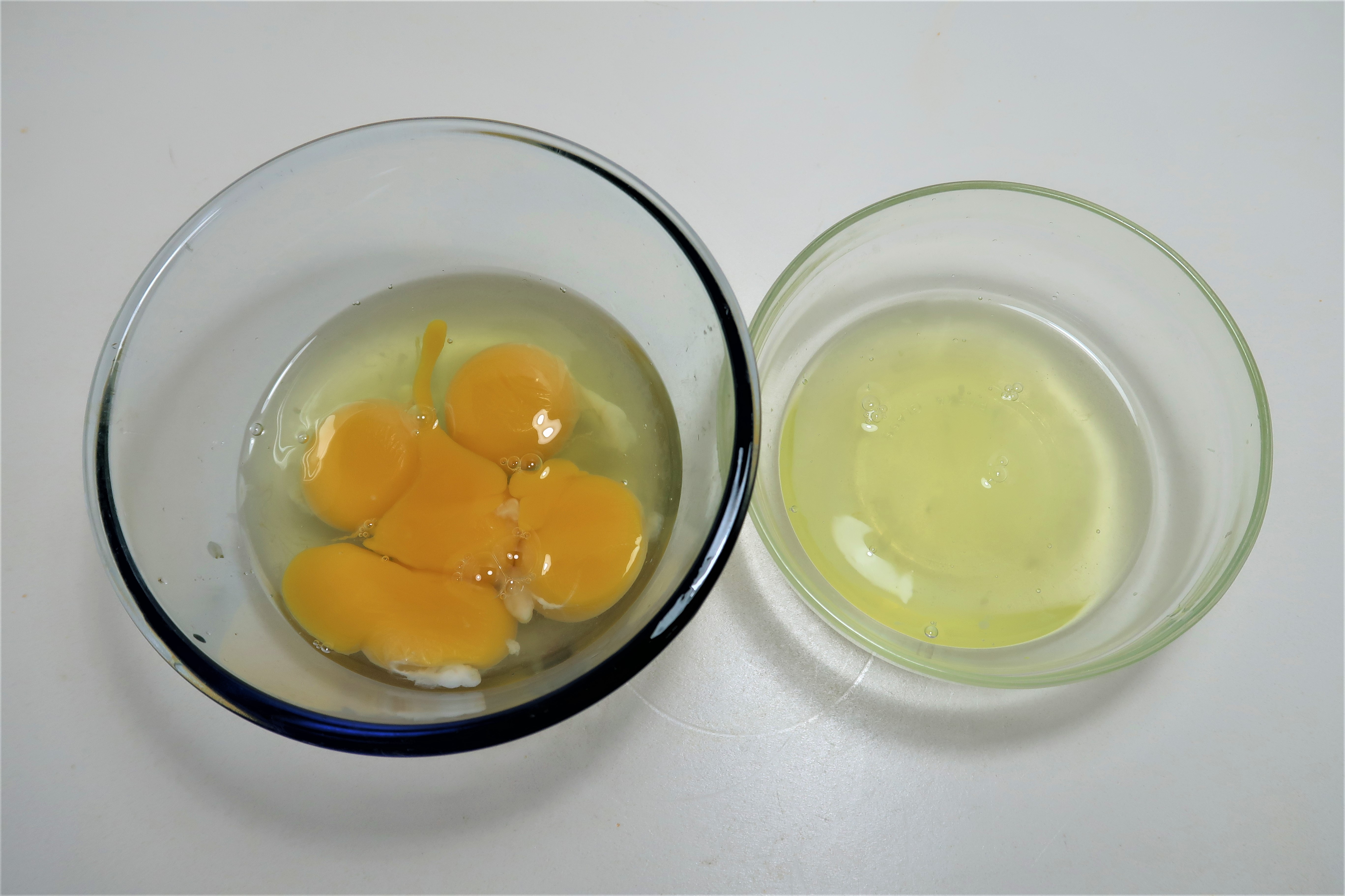 흰자는 알끈을 제거하기 위해 가위로 먼저 끊어주는 것이 좋아요.