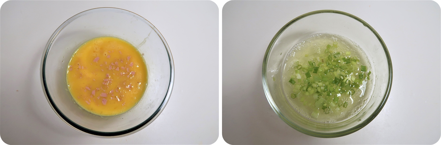 계란 노른자 부분에는 다진 소시지를 넣고 흰자 부분에는 쪽파를 넣어줍니다.