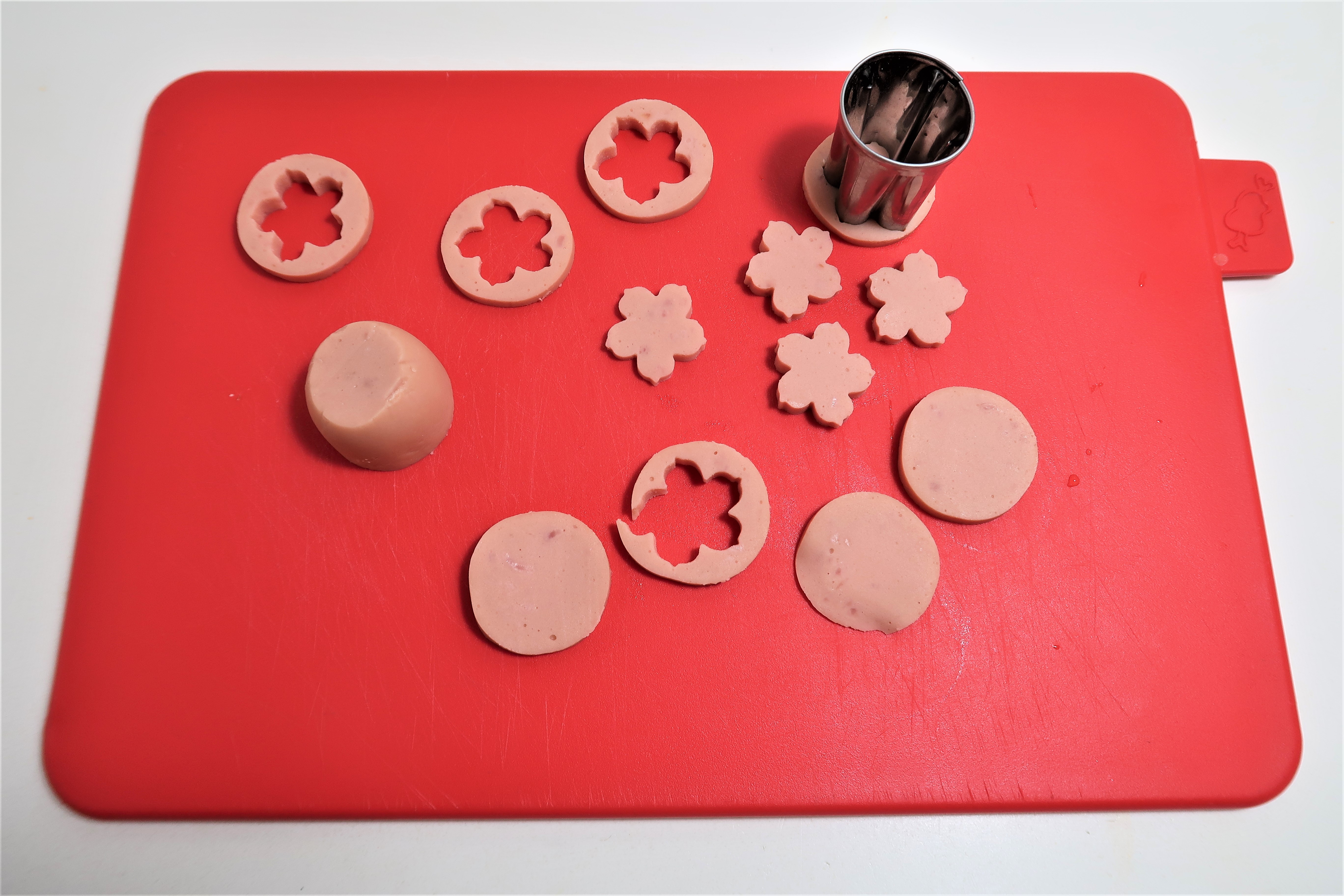 옛날 소시지를 통썰기 후 꽃모양틀로 찍어내는데요.