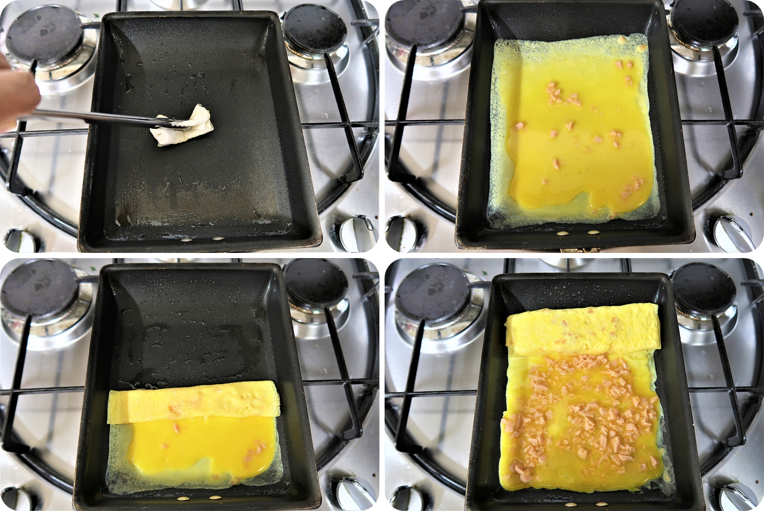 노란 계란물부터 얇게 부어가며 돌돌 말아주는데요. 계속 기름을 묻혀가며 계란을 말아주고 당겨주며 만들어주세요.
