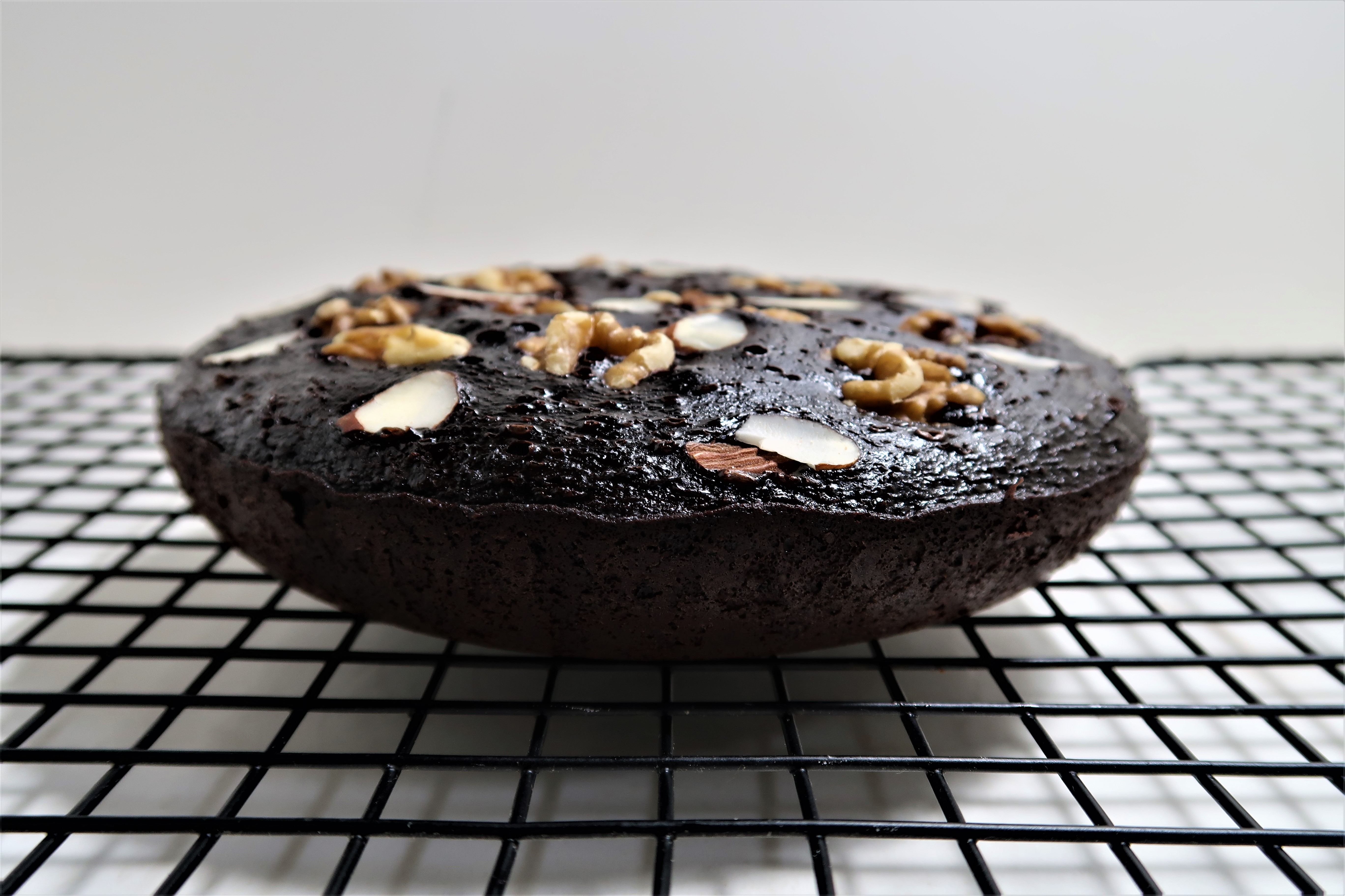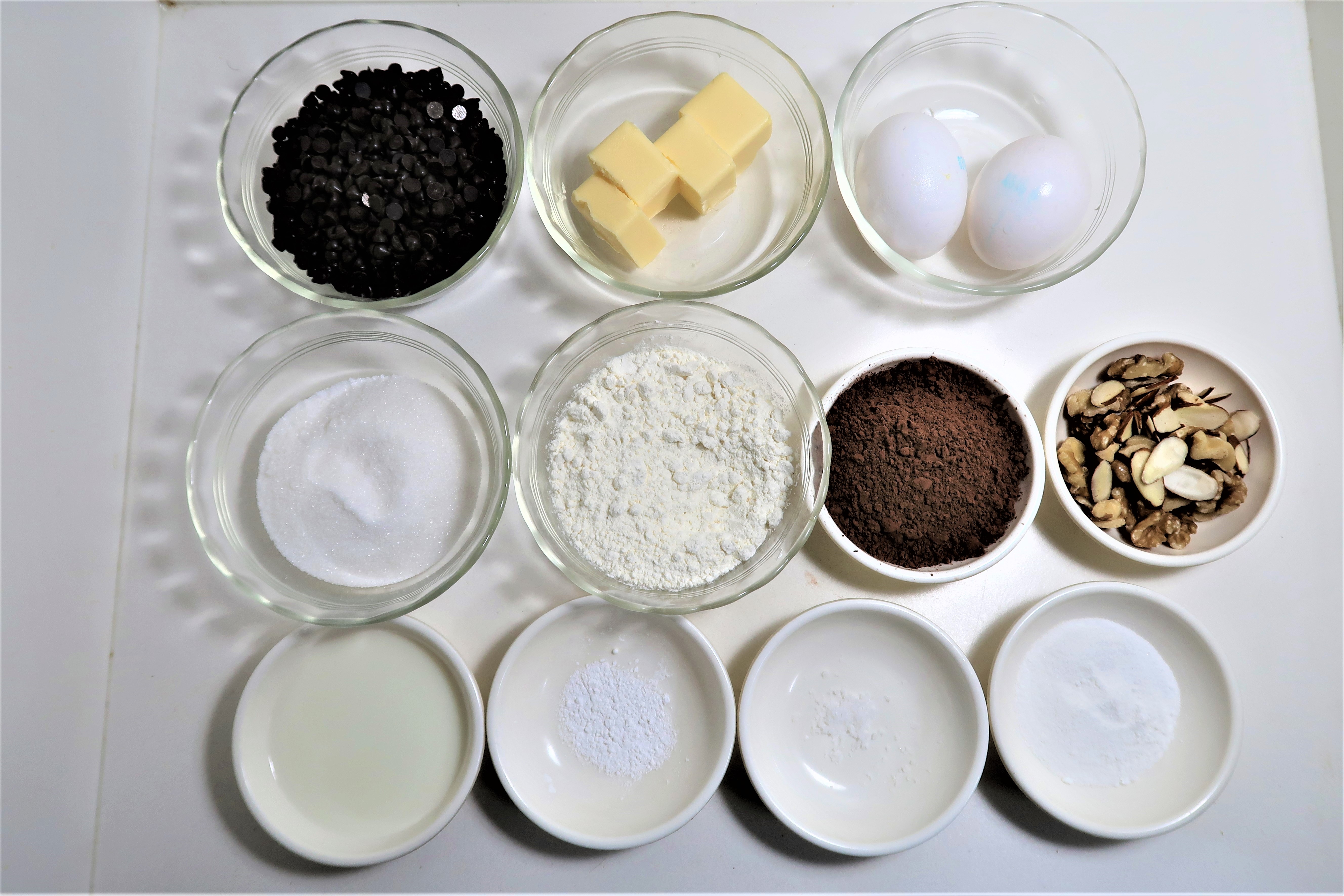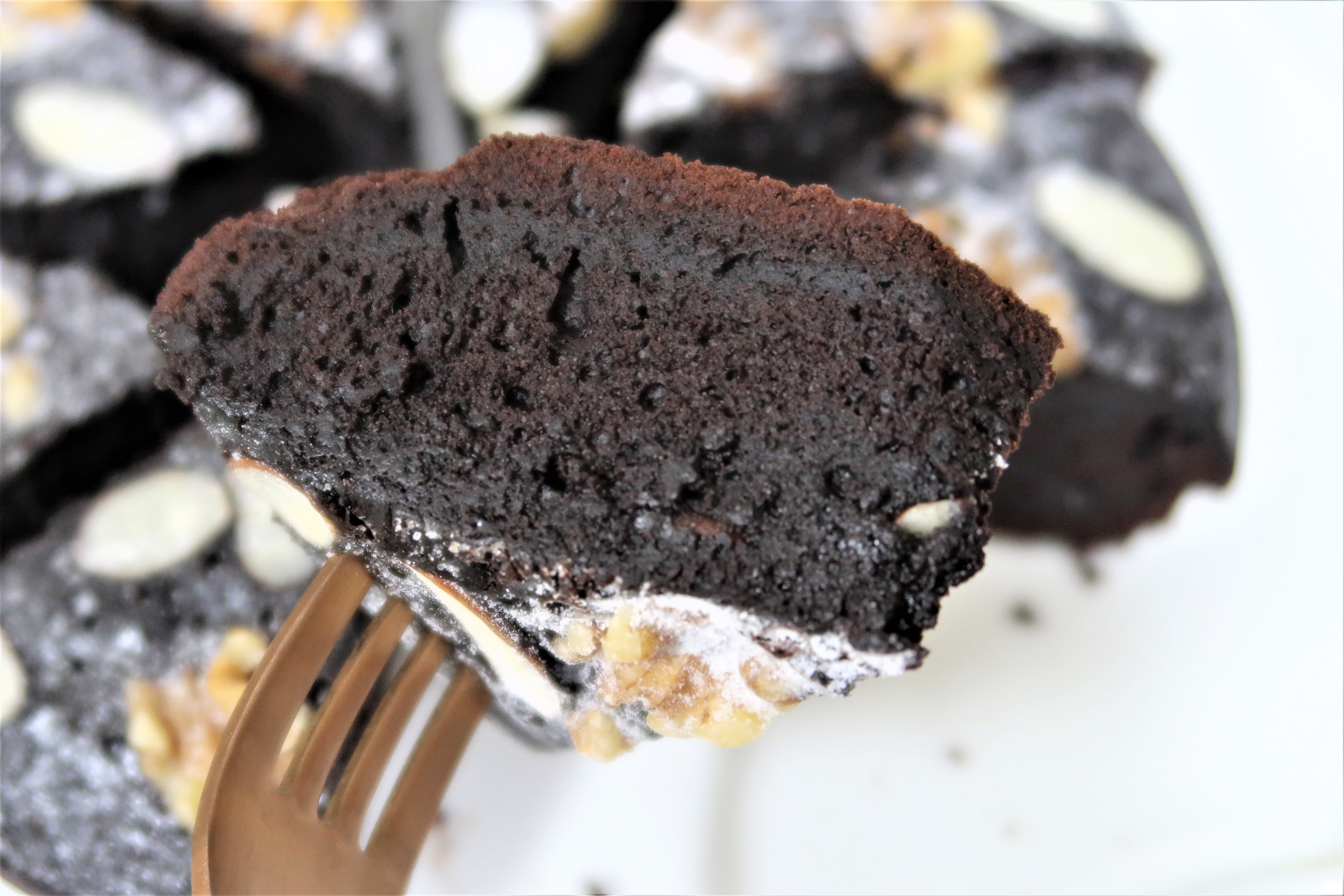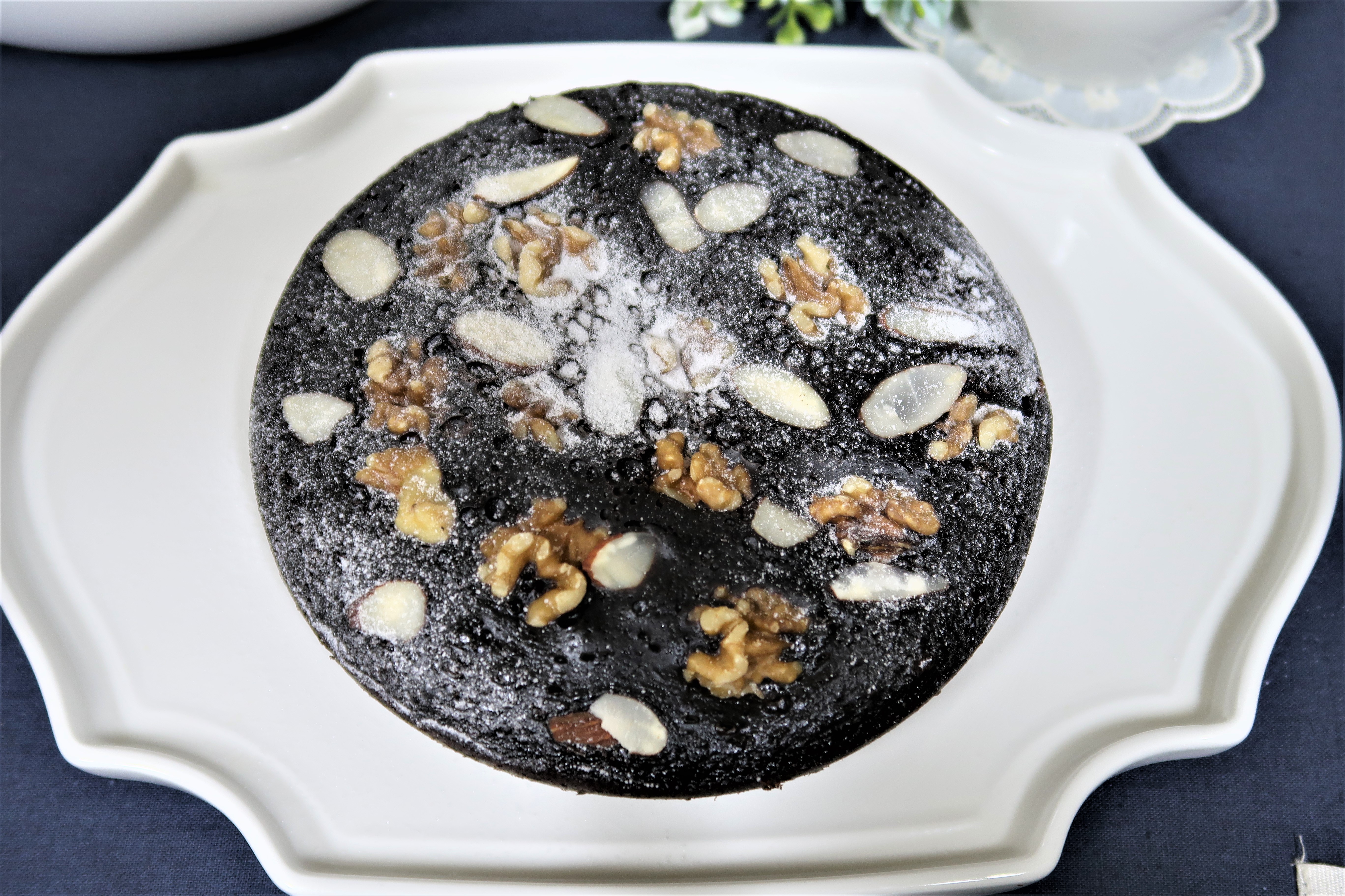 재료 다크 초콜릿 150g, 버터 65g, 달걀 2개, 설탕 60g, 박력분 55g, 코코아 분말 30g, 우유 30g, 소금 약간, 베이킹 파우더 1g, 호두 1줌, 아몬드 슬라이스 약간, 슈가파우더 약간 등