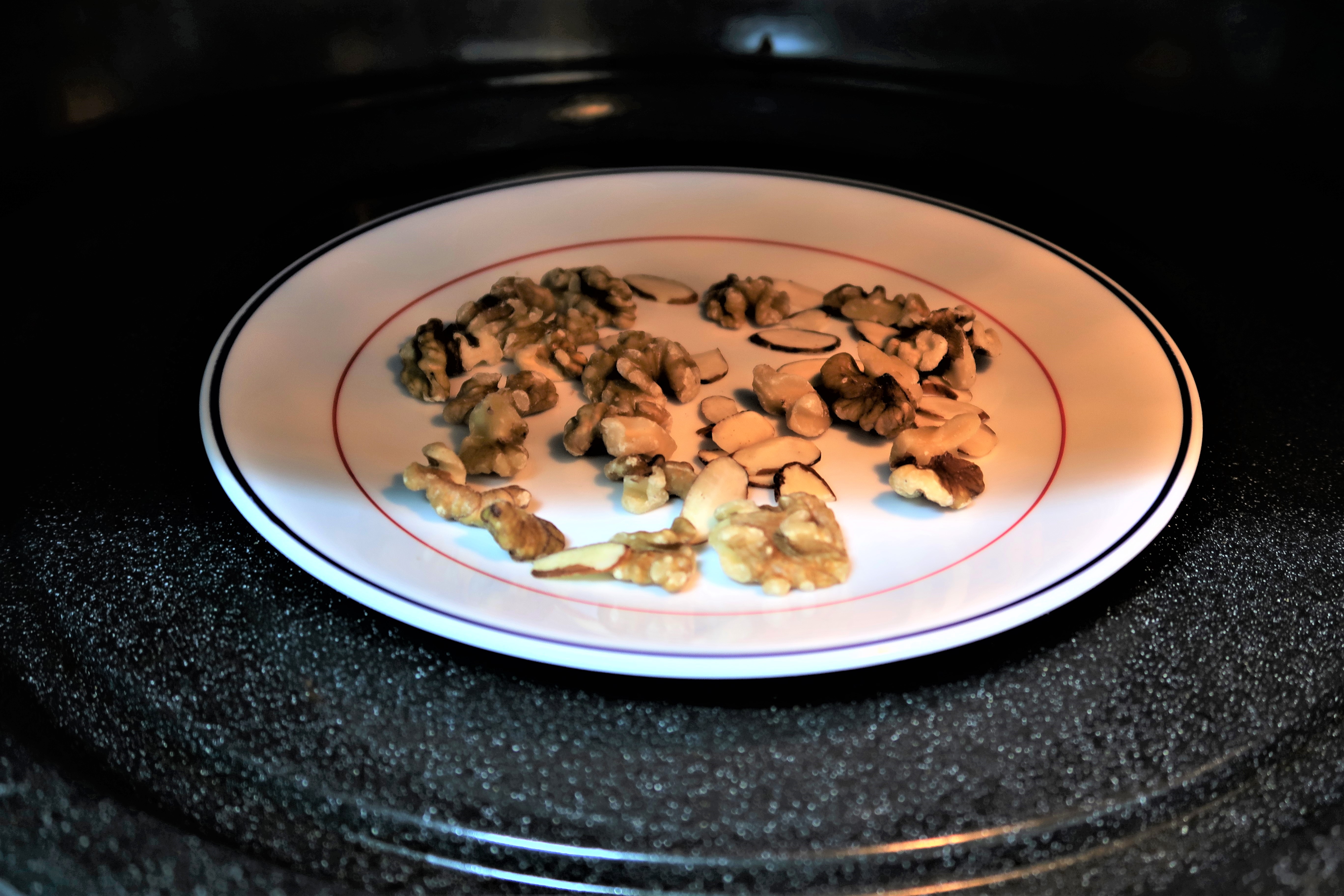 견과류는 접시에 펼쳐 준 뒤 전자레인지에 30초 정도 돌려주세요.
