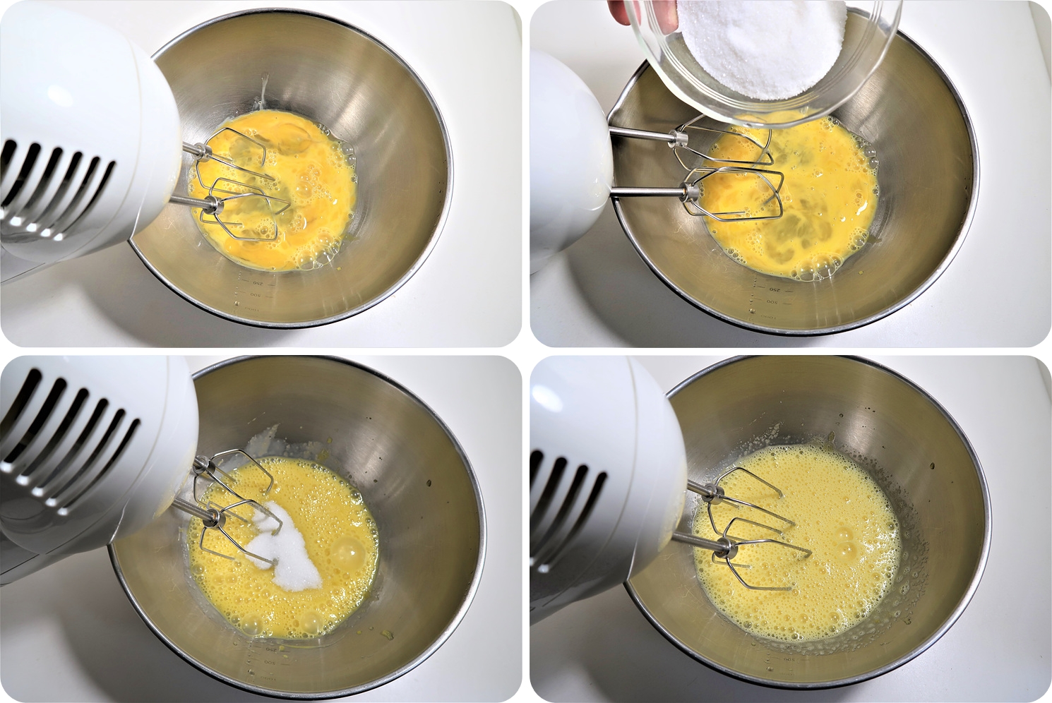 달걀을 거품기로 저어주는데 설탕을 한꺼번에 넣지 말고 조금씩 넣어가면 저어주시는게 좋아요.