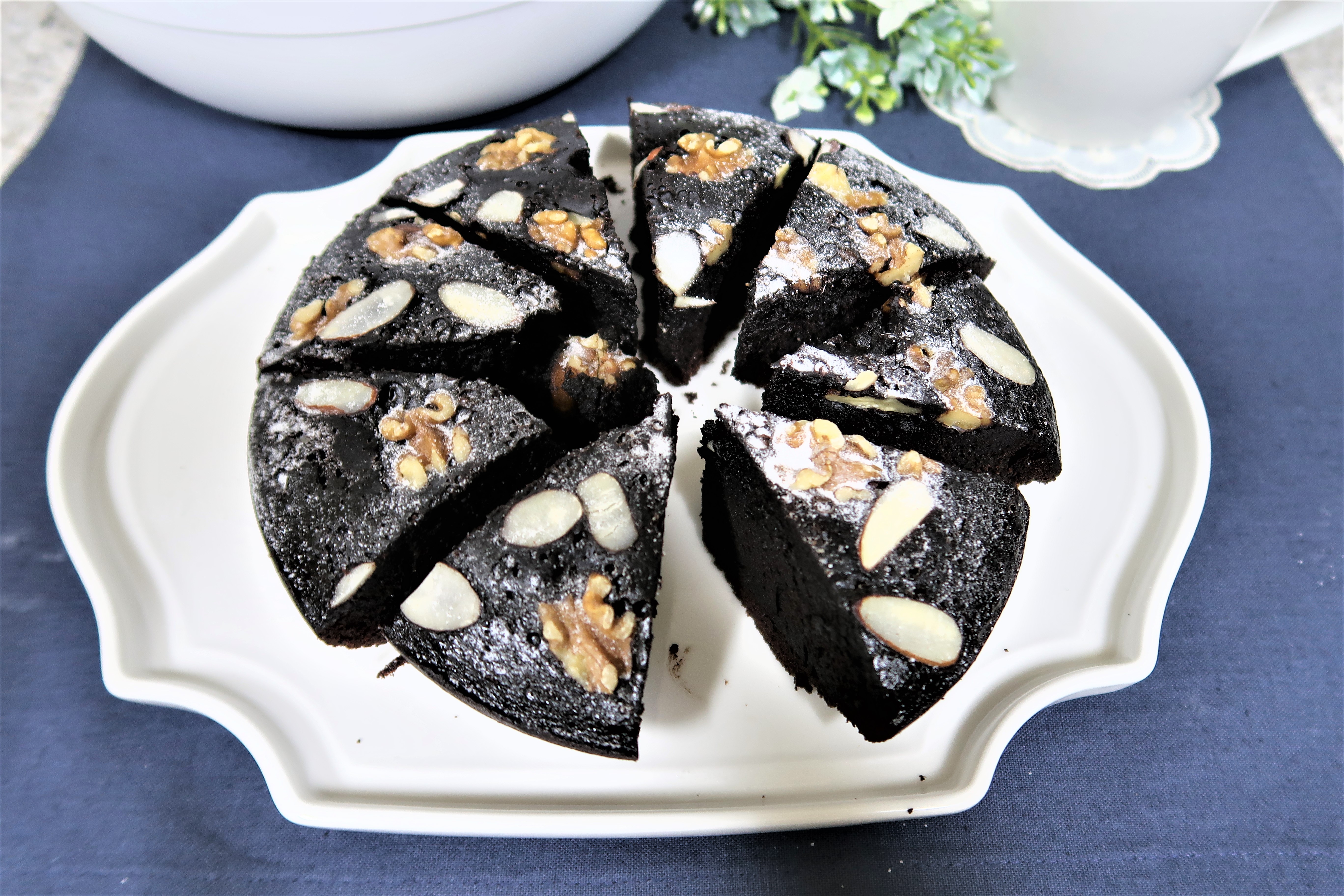 재료 다크 초콜릿 150g, 버터 65g, 달걀 2개, 설탕 60g, 박력분 55g, 코코아 분말 30g, 우유 30g, 소금 약간, 베이킹 파우더 1g, 호두 1줌, 아몬드 슬라이스 약간, 슈가파우더 약간 등