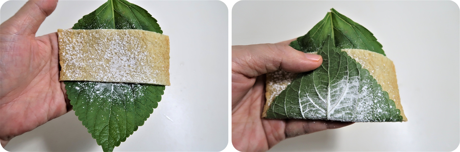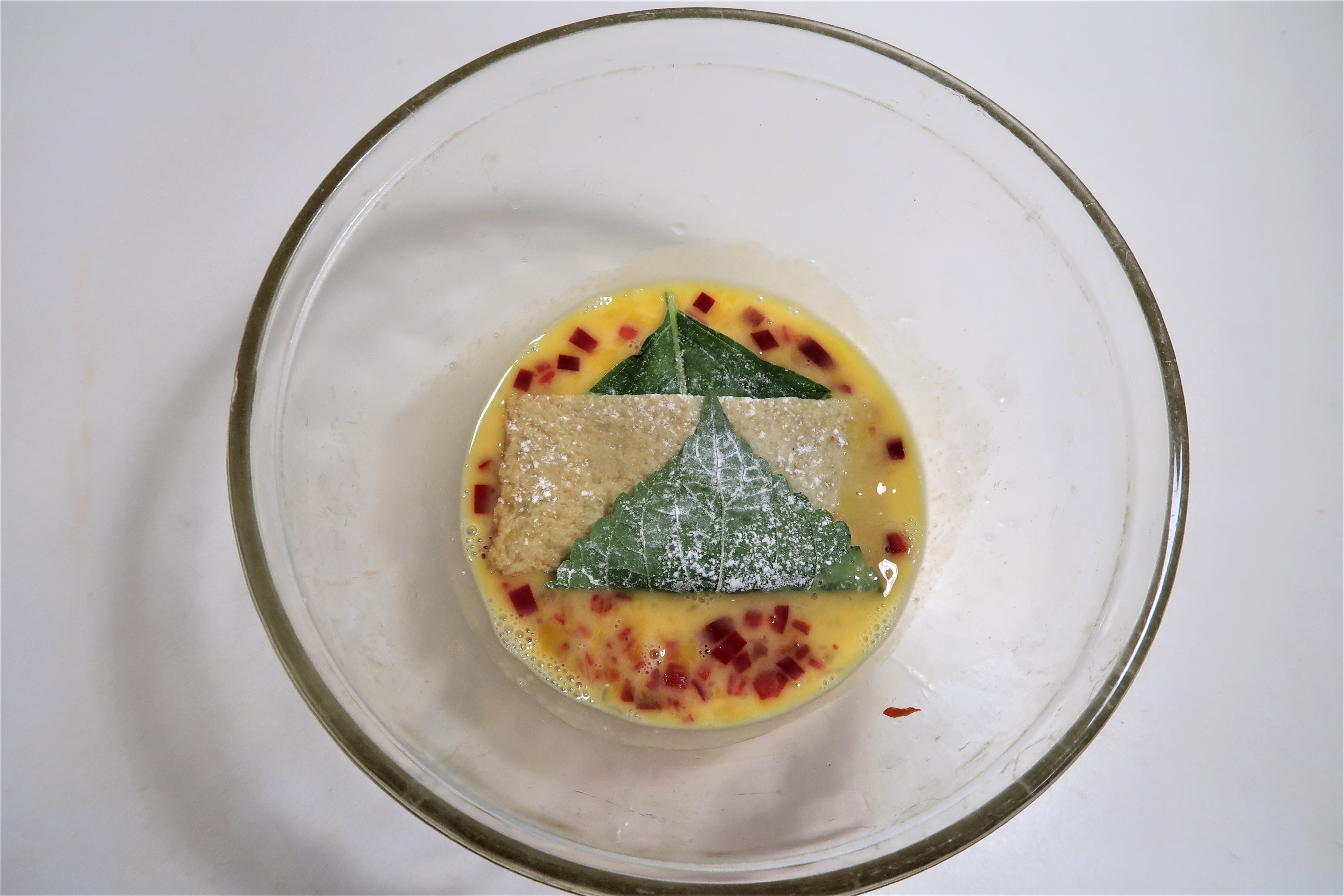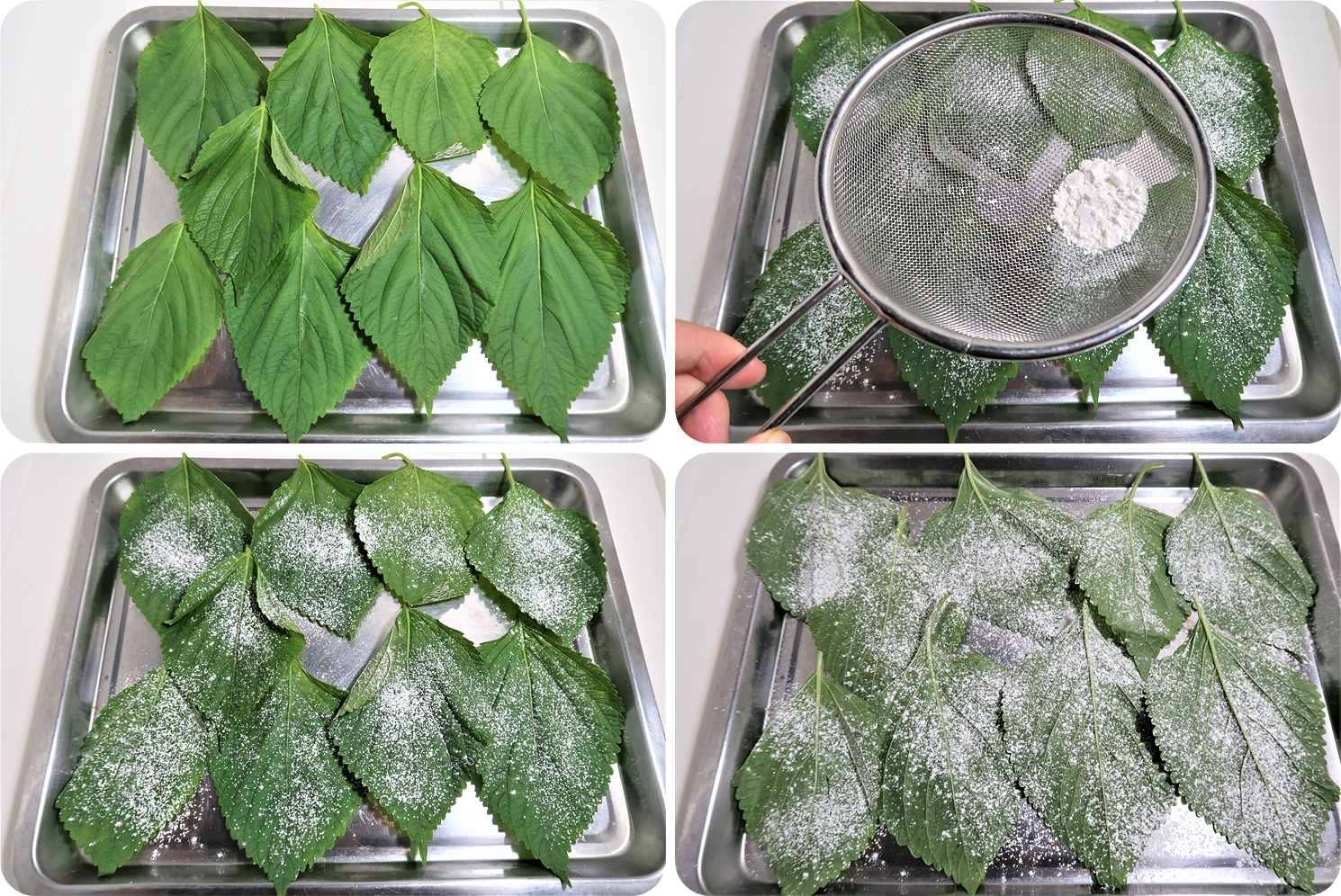 깻잎에도 앞뒤로 튀김가루를 뿌려주세요.