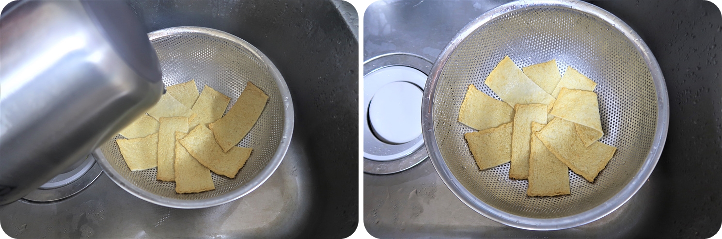 그 다음 전기포트에 물을 끓여서 어묵에 뜨거운 물을 끼얹어서 어묵 기름을 제거해주세요.