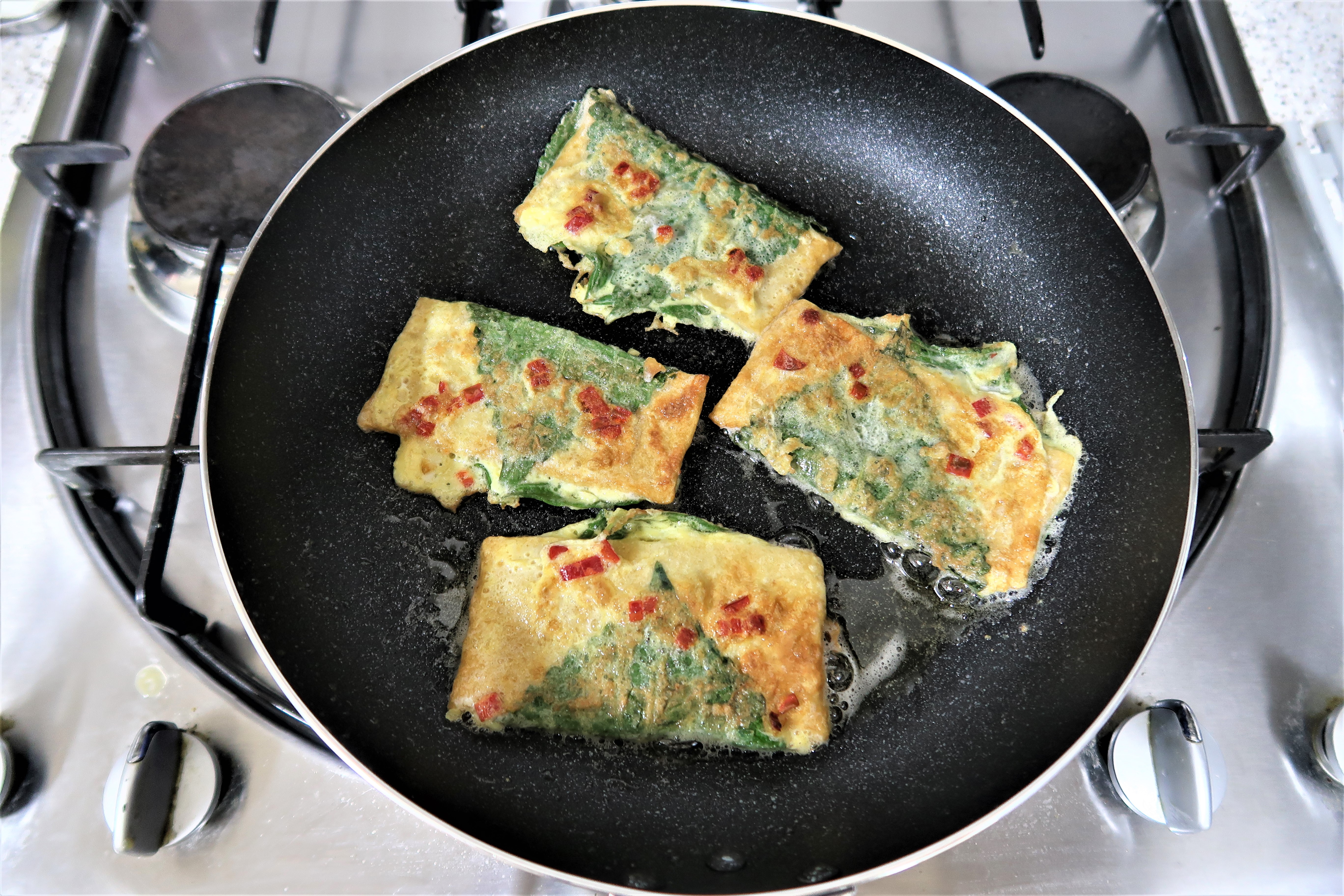 계란 2개를 넣어주고 풀어 준 뒤에 홍고추를 넣어줍니다.