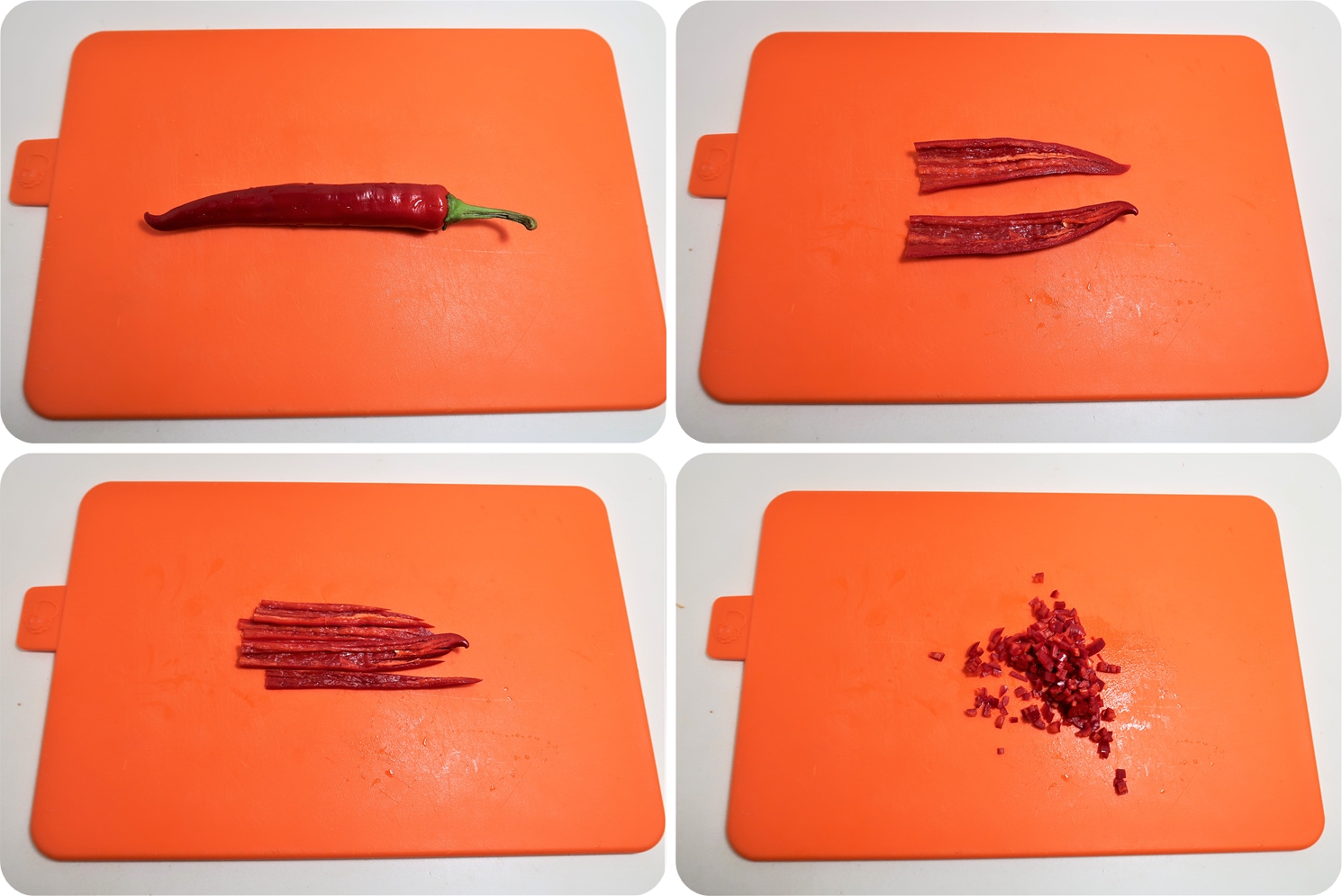홍고추는 반갈라서 씨를 제거하고 길게 자른 후 다지듯 썰어주시면 됩니다.