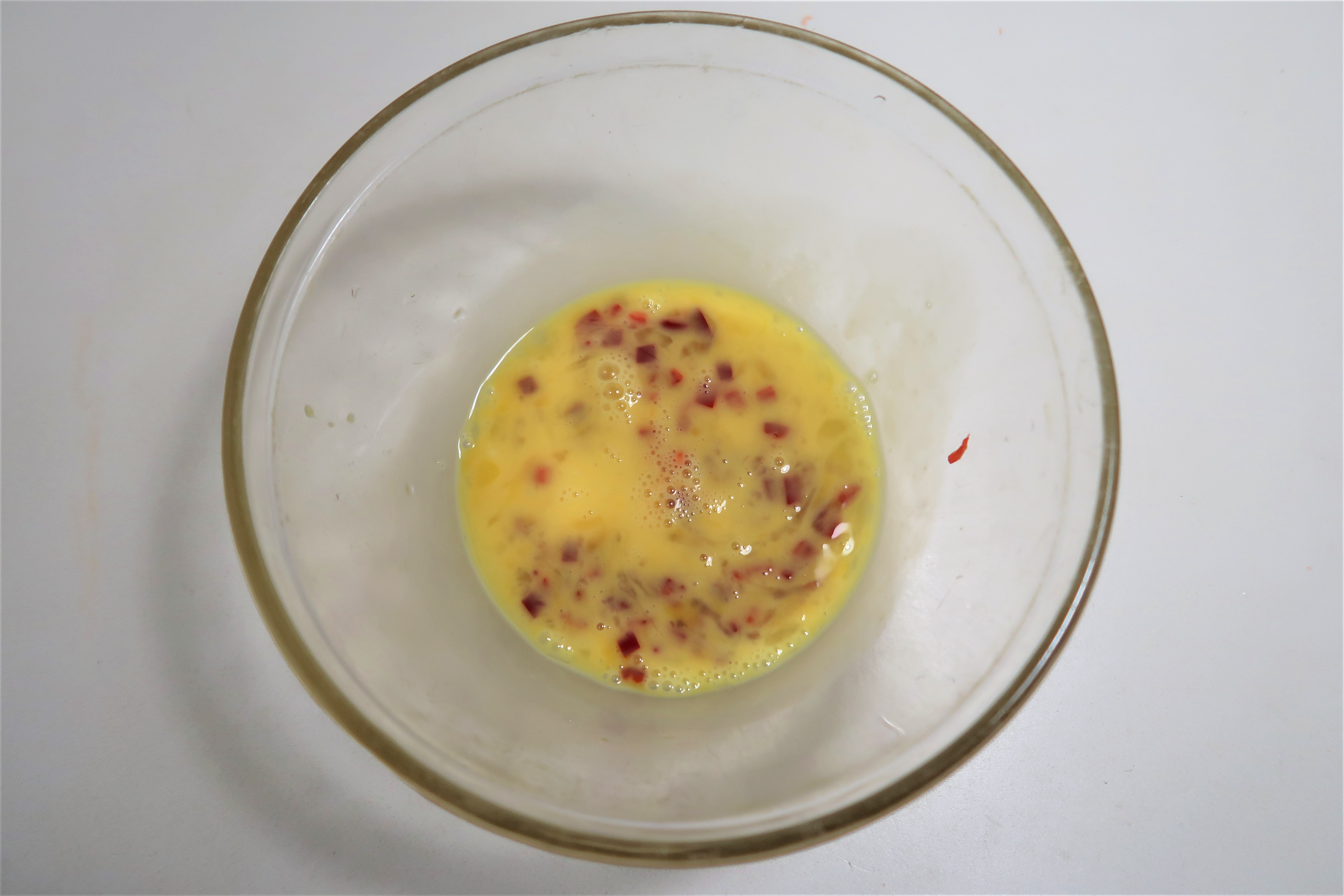 계란 2개를 넣어주고 풀어 준 뒤에 홍고추를 넣어줍니다.