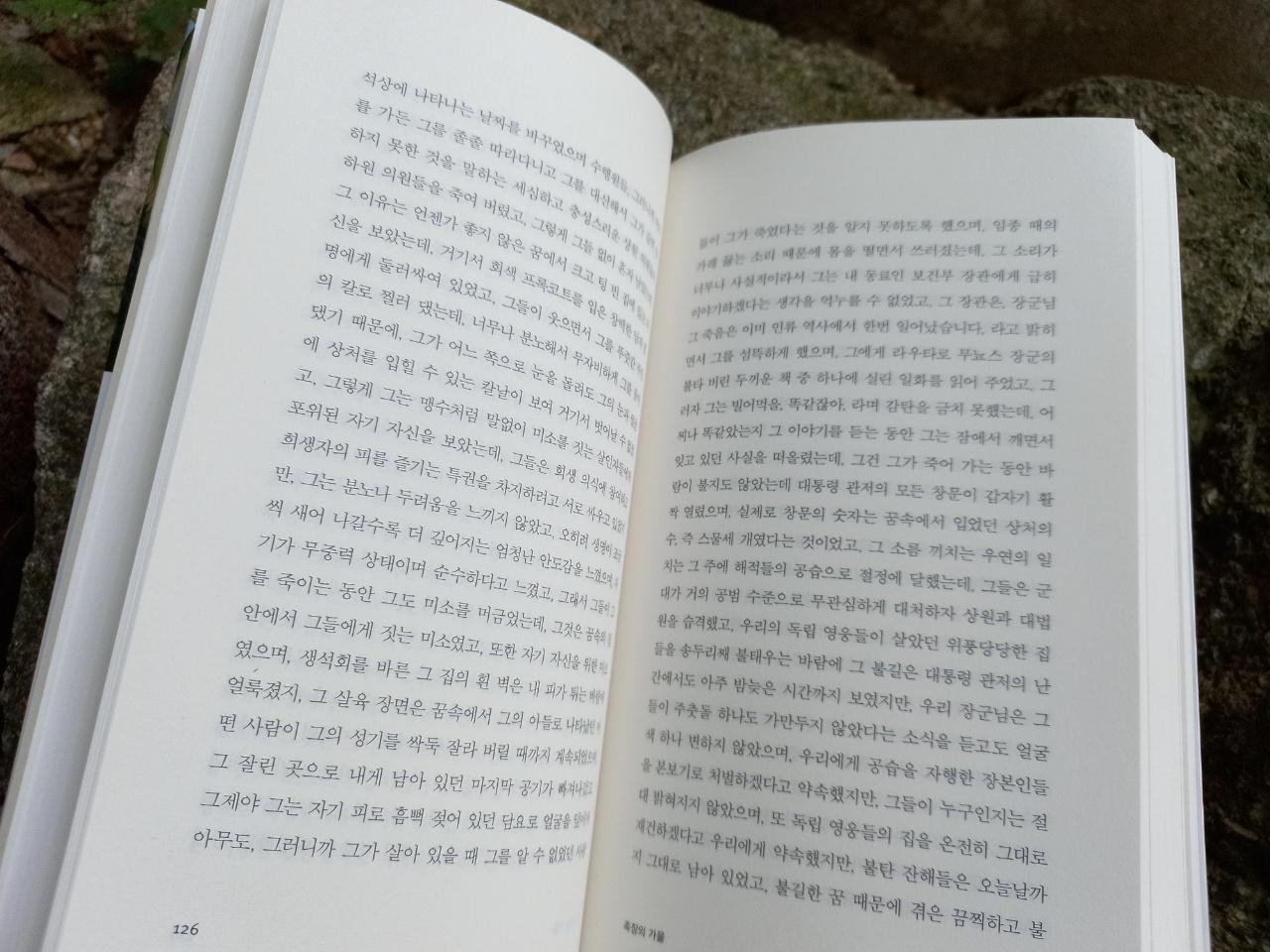 이 책은 작가가 가장 사랑한 소설이라고 하지요. 그리고 이 소설을 일컬어 '시어(時語)로 쓴 소설'이라고 하니 어떤 느낌인지 짐작이 가시는지요? 시적인 감수성이 작품에 깔려 있는데 한편으로는 전반적으로 난해하기도 합니다. 한 문장이 수십 페이지로 이어져 있어 쉼표(,)로 이어진 문장을 긴 호흡으로 읽어야 합니다. 모호한 시공간과 서술구조는 독자들에게 긴장감을 갖게 하지요. 이 소설은 번역자의 말대로 음미하면서 천천히 여러 번을 읽을 때 비로소 그 내용을 제대로 이해할 수 있는 것 같습니다.