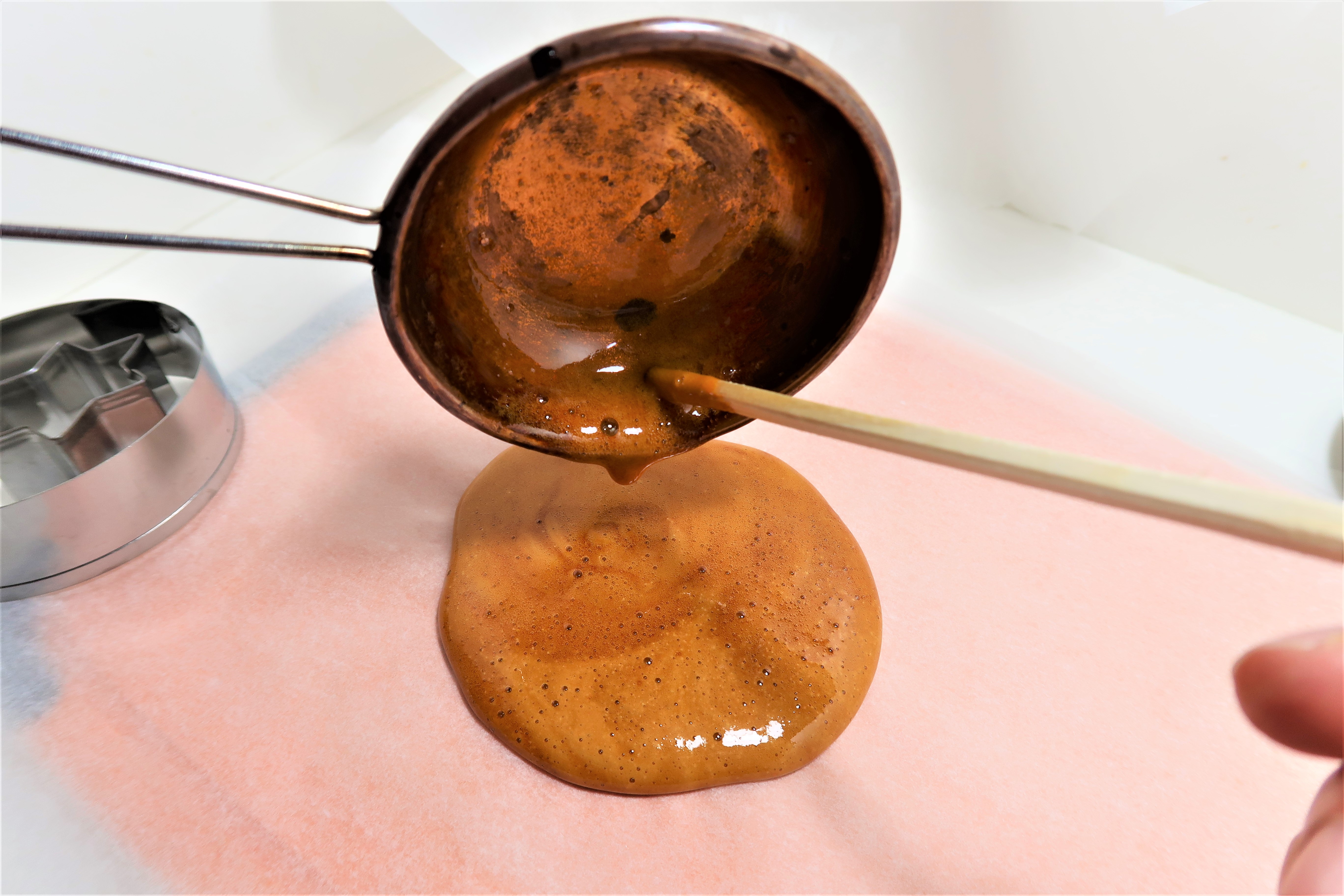 도마에 종이호일을 깔고 달고나를 부어주세요. 안 그러면 다 달라붙어요.
