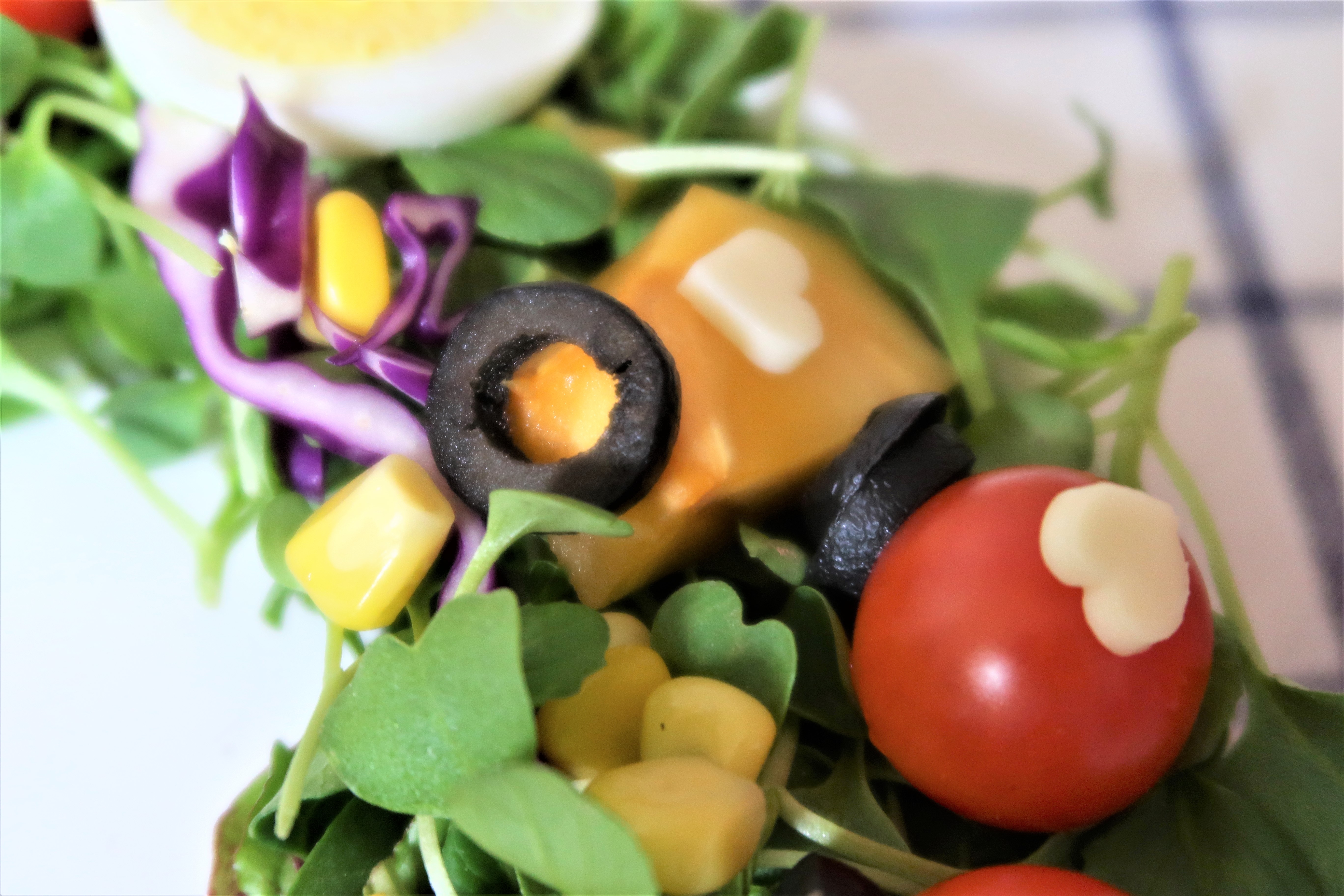 어린잎, 단감, 적양배추, 방울토마토, 삶은 달걀, 체다치즈, 캔옥수수알, 블랙올리브 등등을 준비합니다.