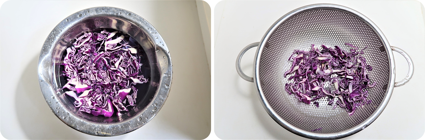 5분 정도 물에 담궈주면 적양배추의 색상이 물에 빠져 나와서 물이 보라빛으로 되는데요.