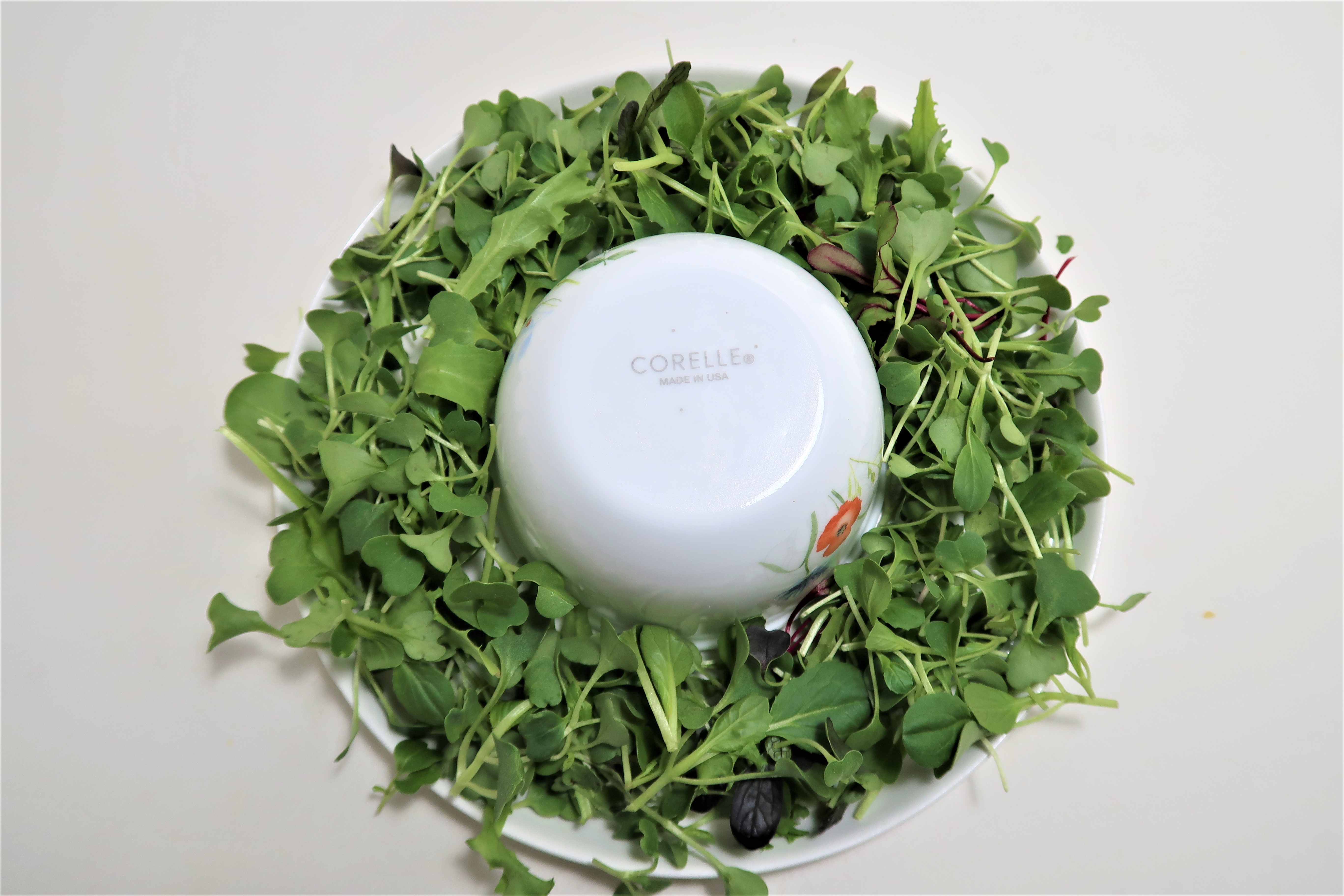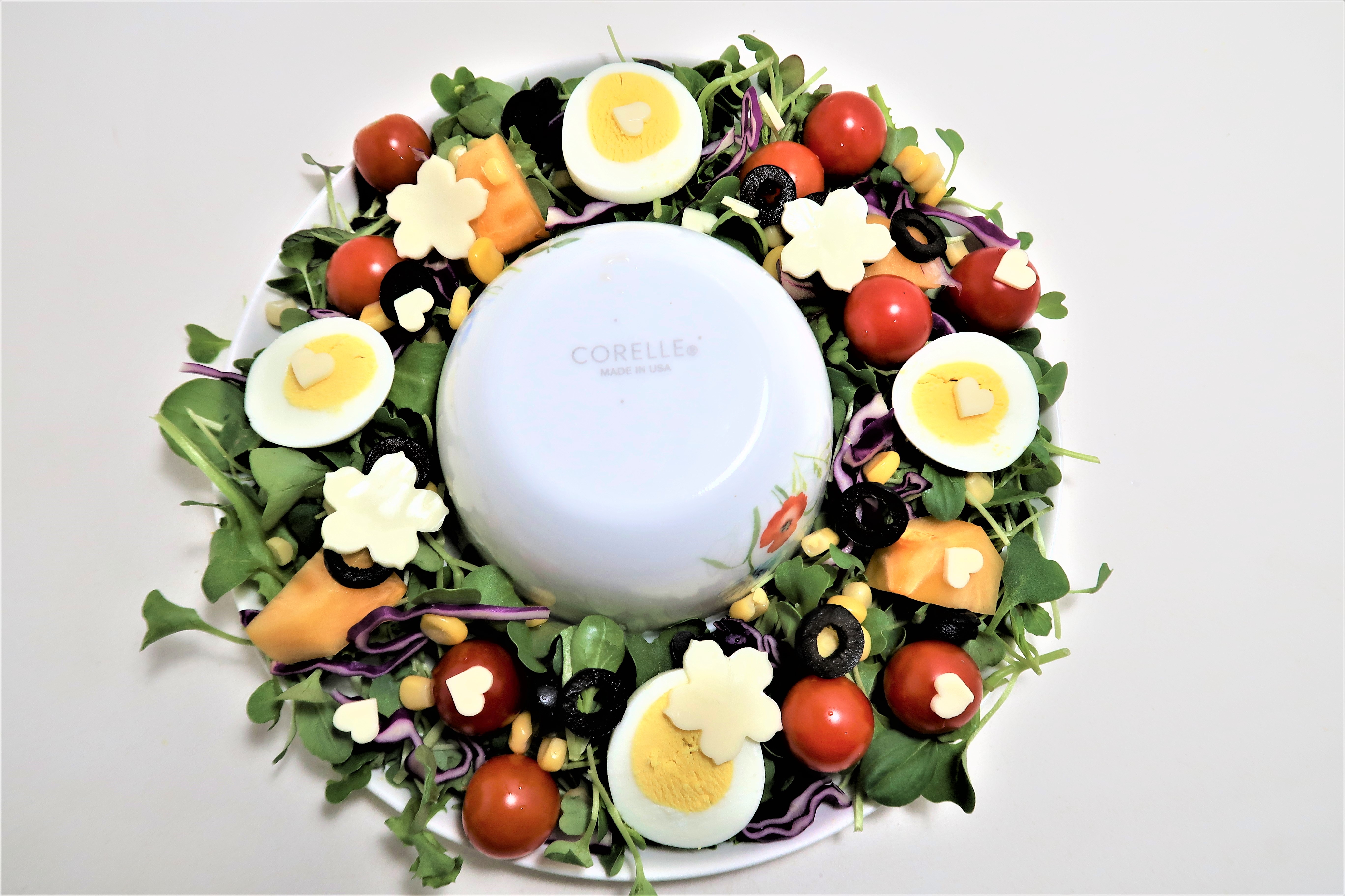 완성 접시 가운데 밥공기를 엎어두고 어린 잎을 리스 모양으로 뺑 둘러주면 됩니다.