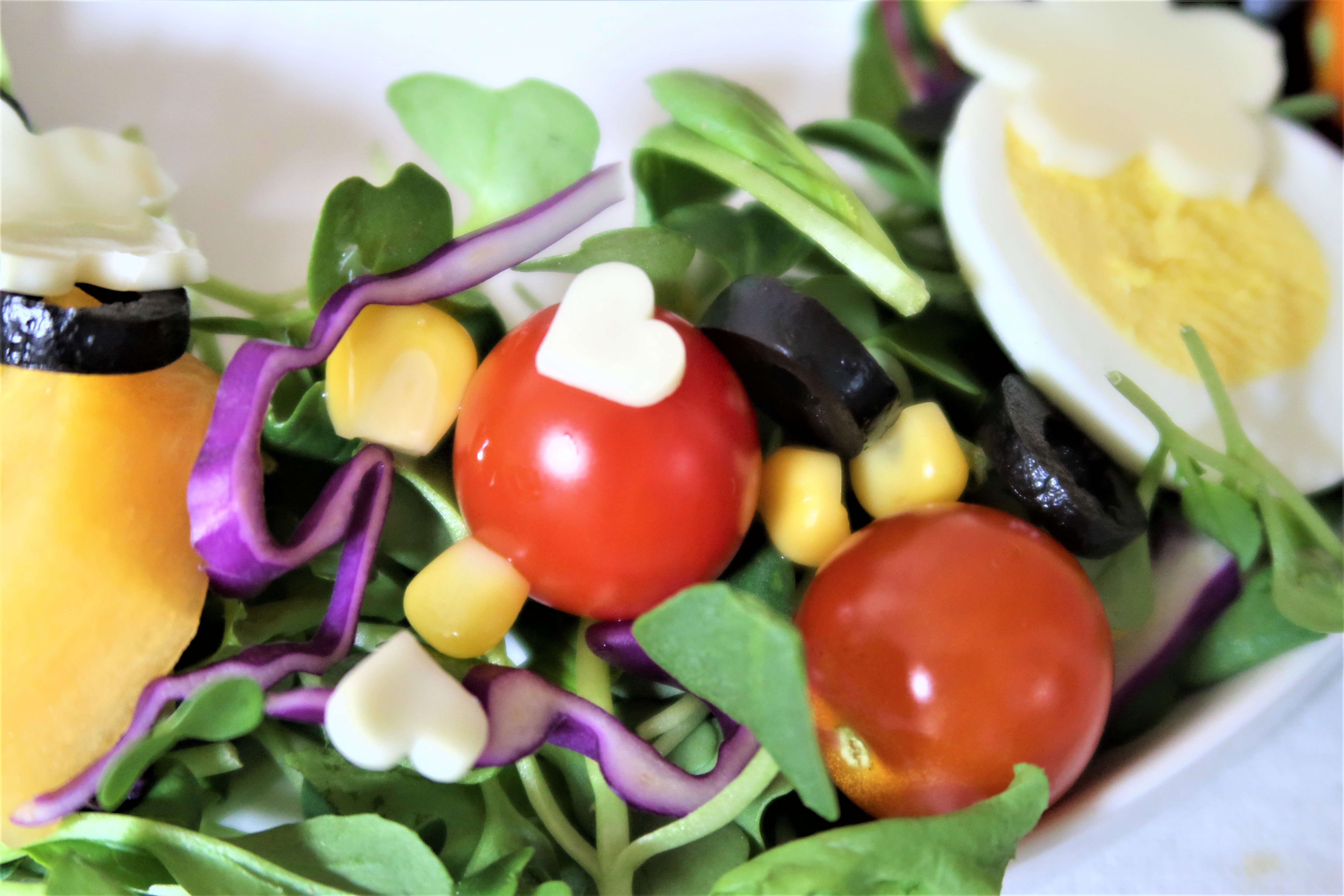 적양배추채, 방울토마토, 단감, 삶은 달걀 등을 올려주세요.