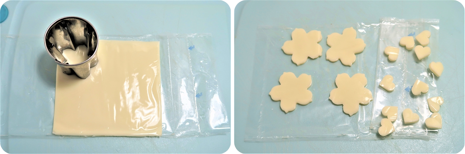 치즈 봉지를 깔고 모양틀로 찍어내면 들러 붙지 않아서 좋아요.