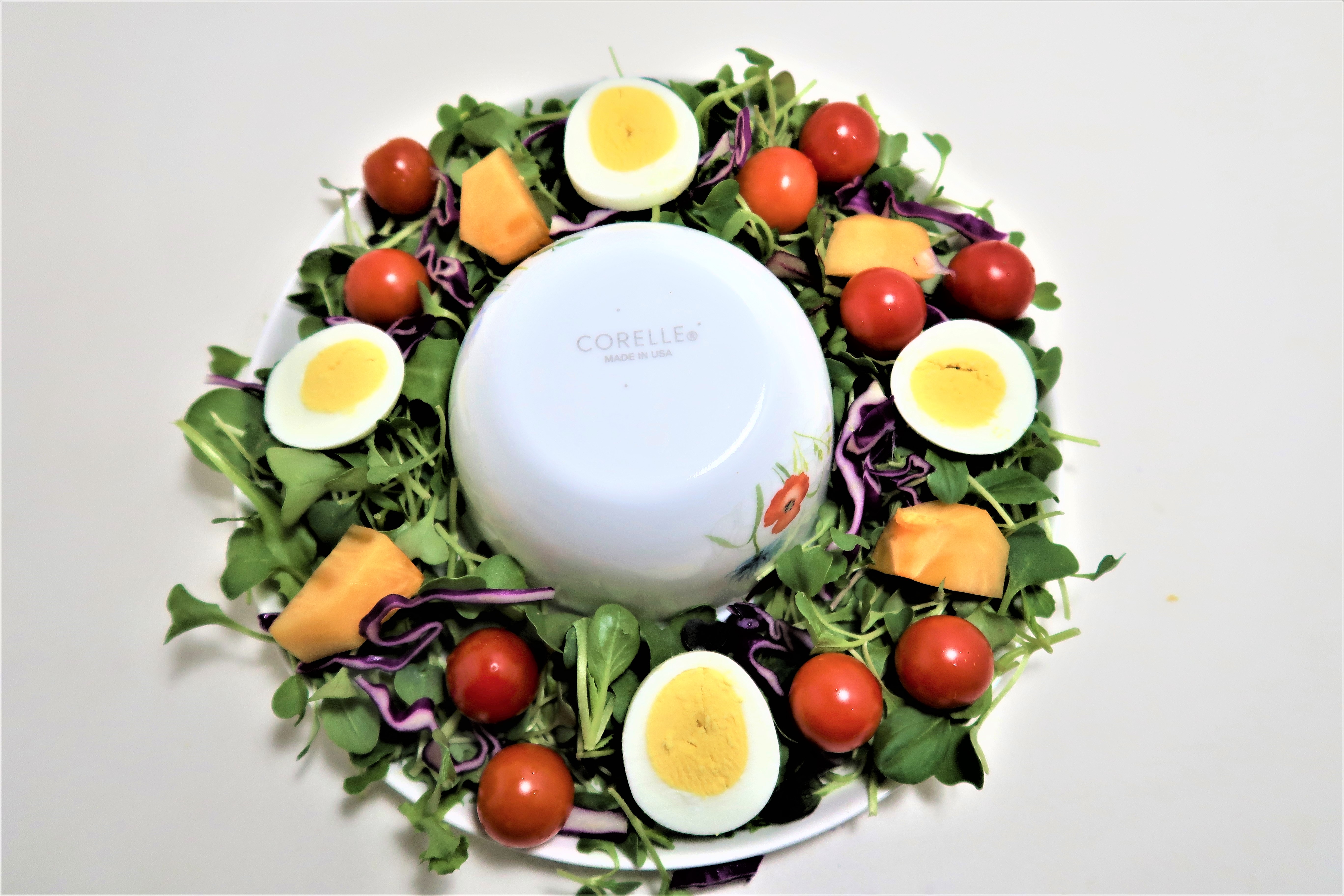 완성 접시 가운데 밥공기를 엎어두고 어린 잎을 리스 모양으로 뺑 둘러주면 됩니다.