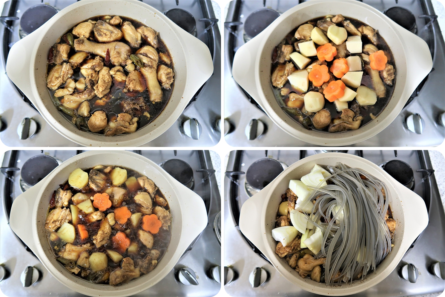 양념 소스가 끓으면 데친 닭을 넣고 뚜껑을 덮고 중불에서 10분간 끓여주세요.