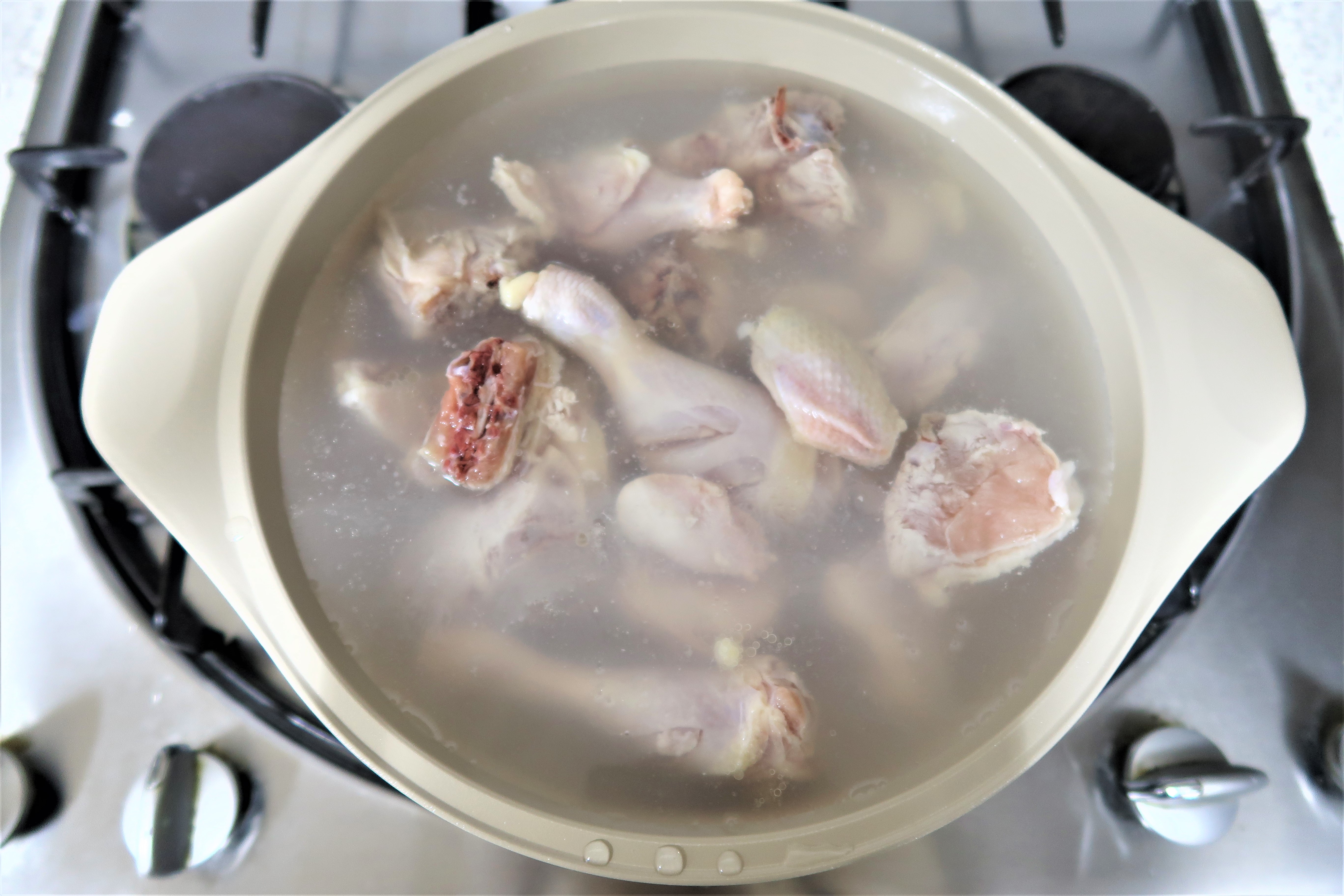 끓는 물에 닭을 한번 데쳐주세요. 기름기도 제거하고 깔끔해져서 좋아요.