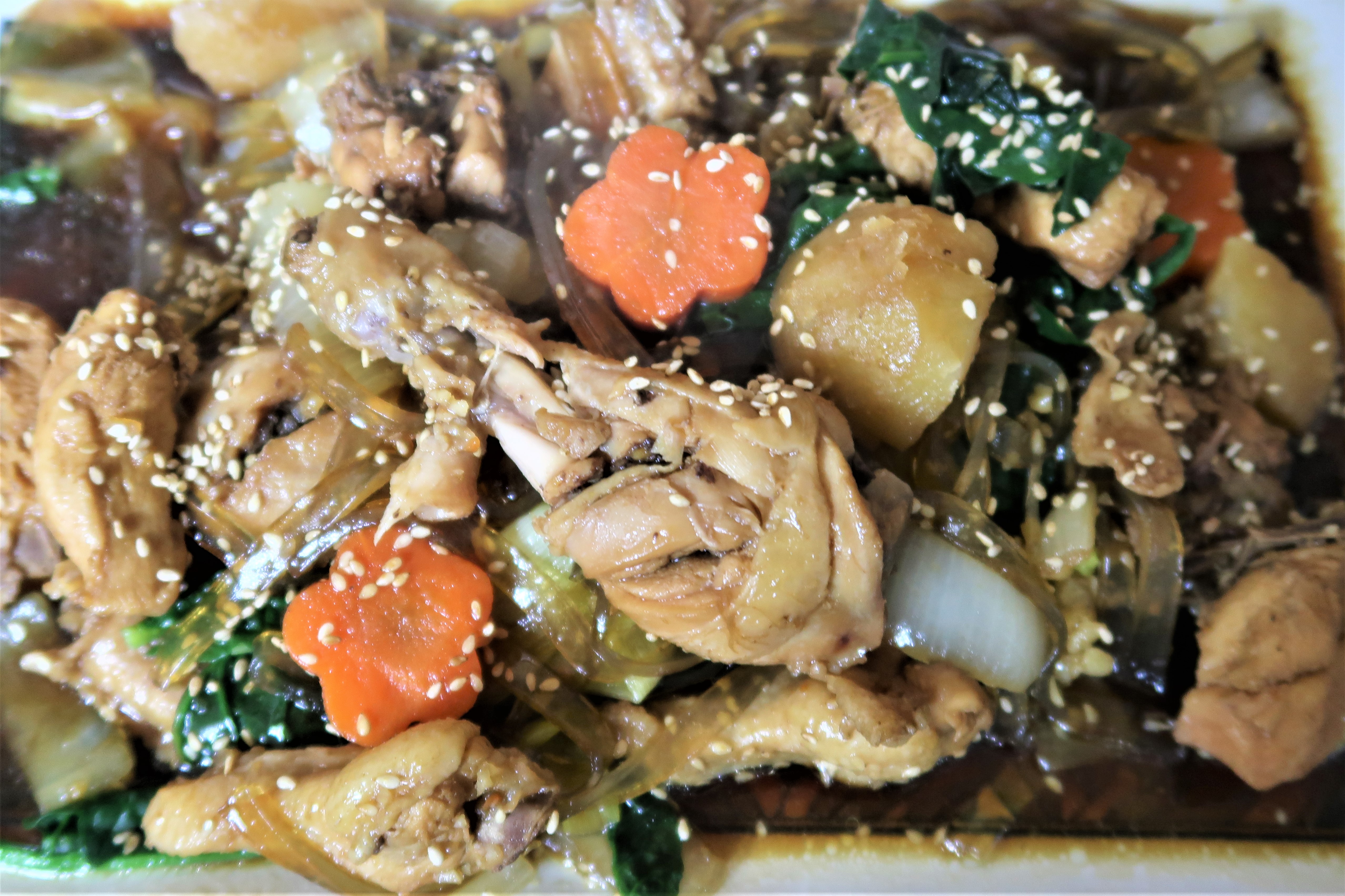 재료 닭고기 (1마리 닭볶음탕용800g), 감자 200g, 대파 30g, 양파 230g, 당근 50g, 시금치 50g, 불린 넙적 당면 (불리기전 150g)