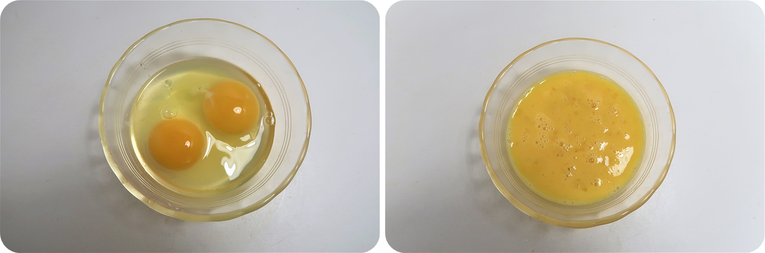 계란 2개를 잘 풀어주세요. 알끈은 제거하면 더욱 좋아요.