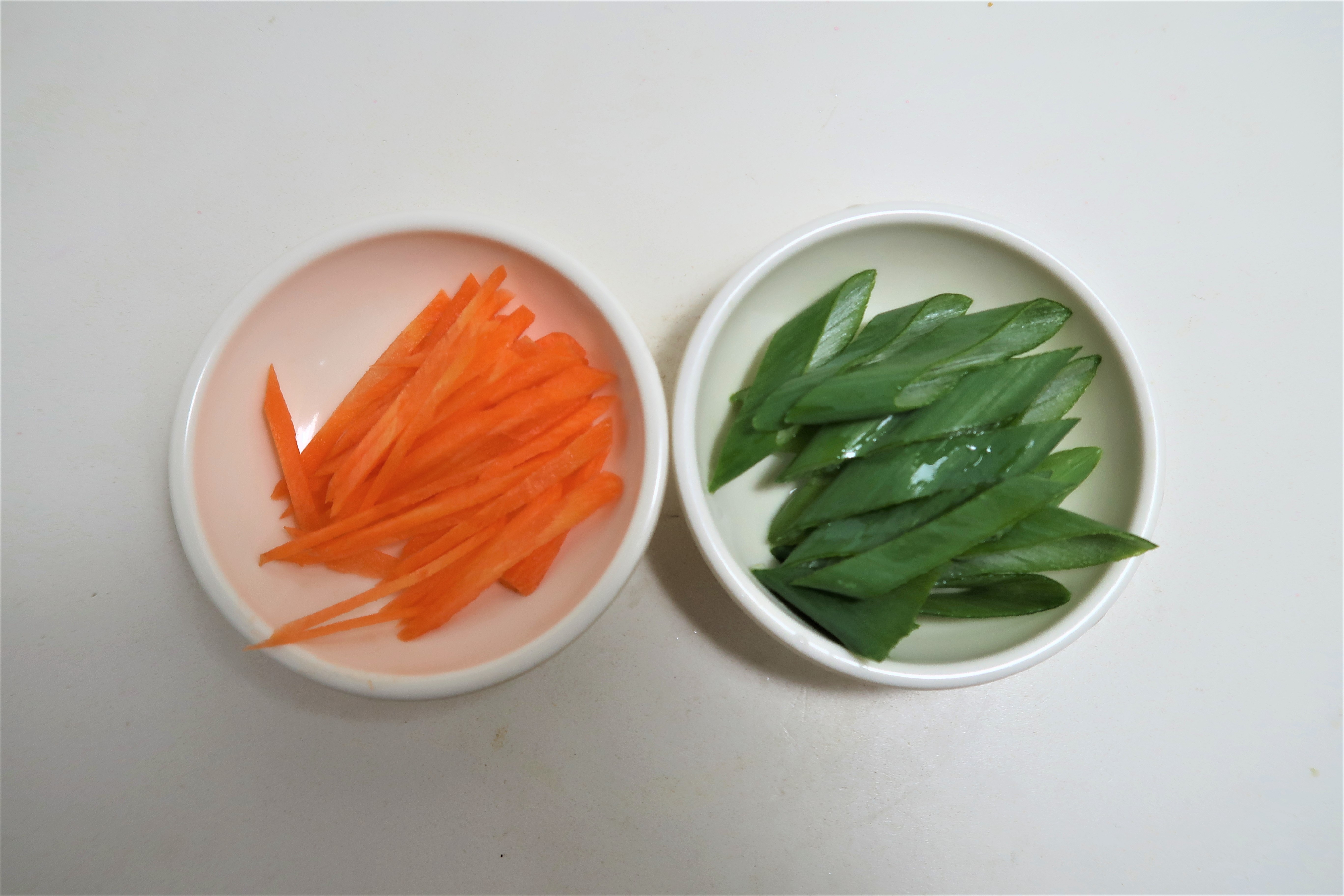 당근은 곱게 채썰고 대파는 어슷썰어줍니다. 당근이나 대파는 색상이 알록달록 예쁘죠.