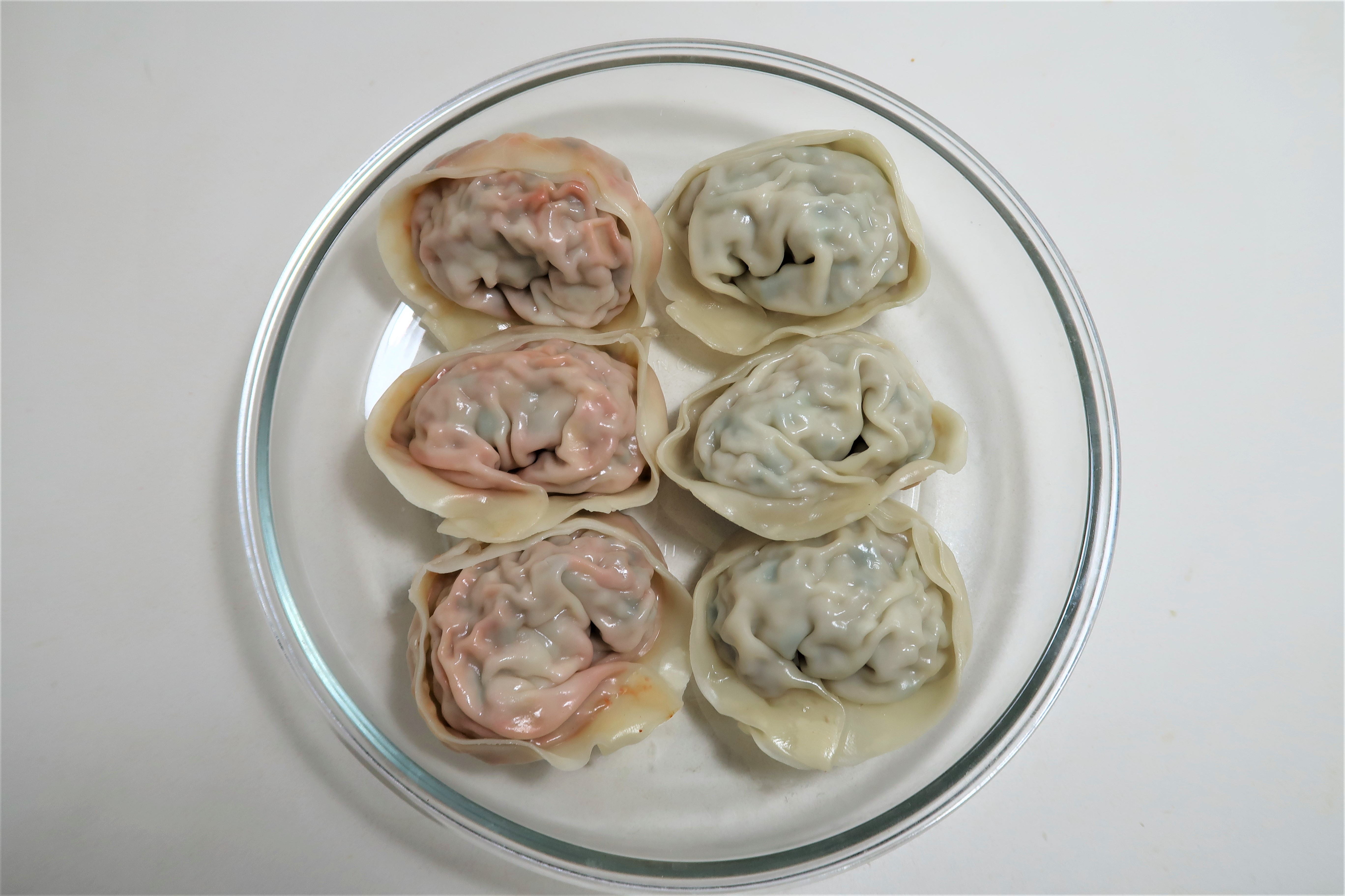 색상으로 구분이 가지요? 빨간 게 김치만두입니다.