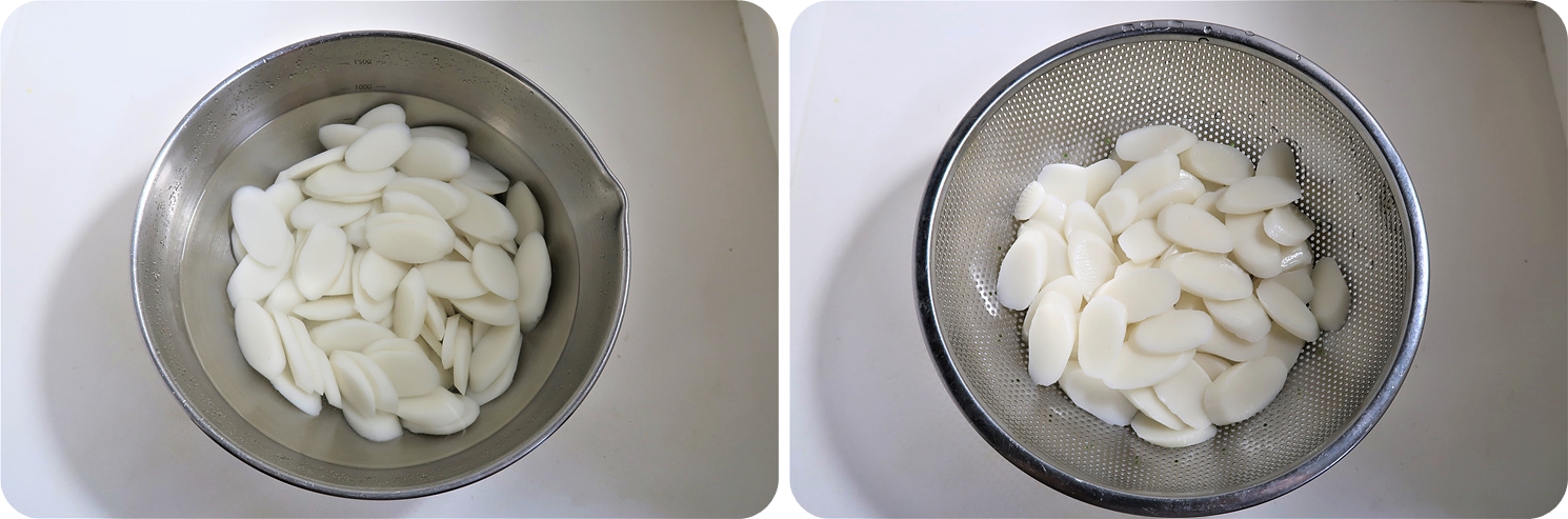 찬물에 떡국떡을 30분 담갔다가 물기를 빼주세요.