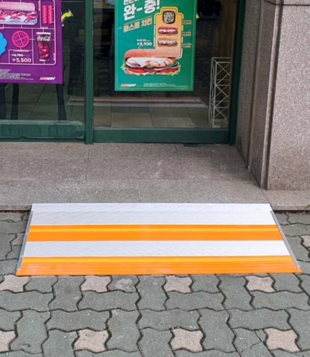 서대문구 내 소규모 점포의 경사로 설치는 법적 의무사항이 아니어서 휠체어를 탄 장애인이 드나들기 어려운 경우가 많습니다.
