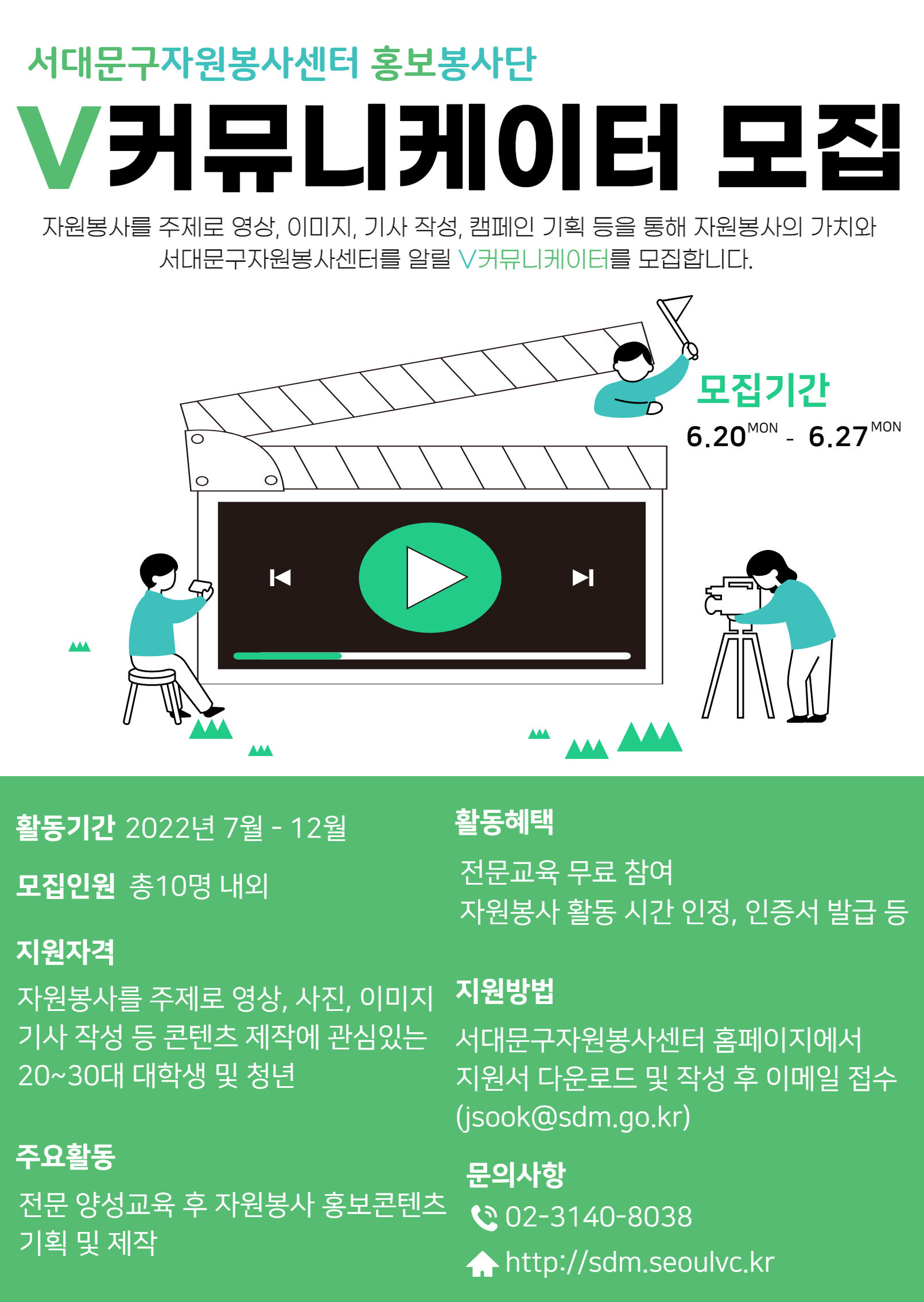 서대문구는 자원봉사 홍보 콘텐츠 제작과 공익적인 캠페인 기획 등을 통해 서대문 자원봉사의 가치를 확산시킬 자원봉사 홍보봉사단 "V커뮤니케이터"를 모집합니다.